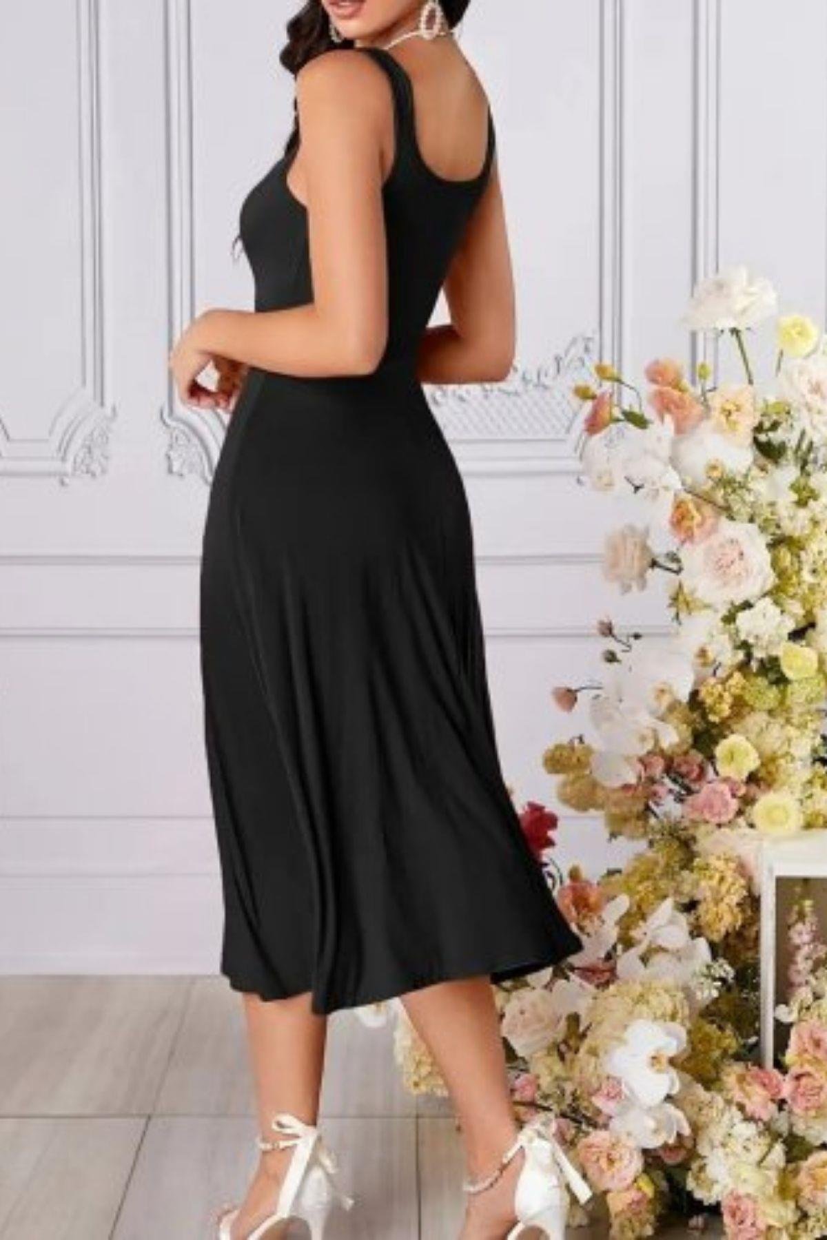 Kare Yaka Askılı Kloş Elbise - Siyah