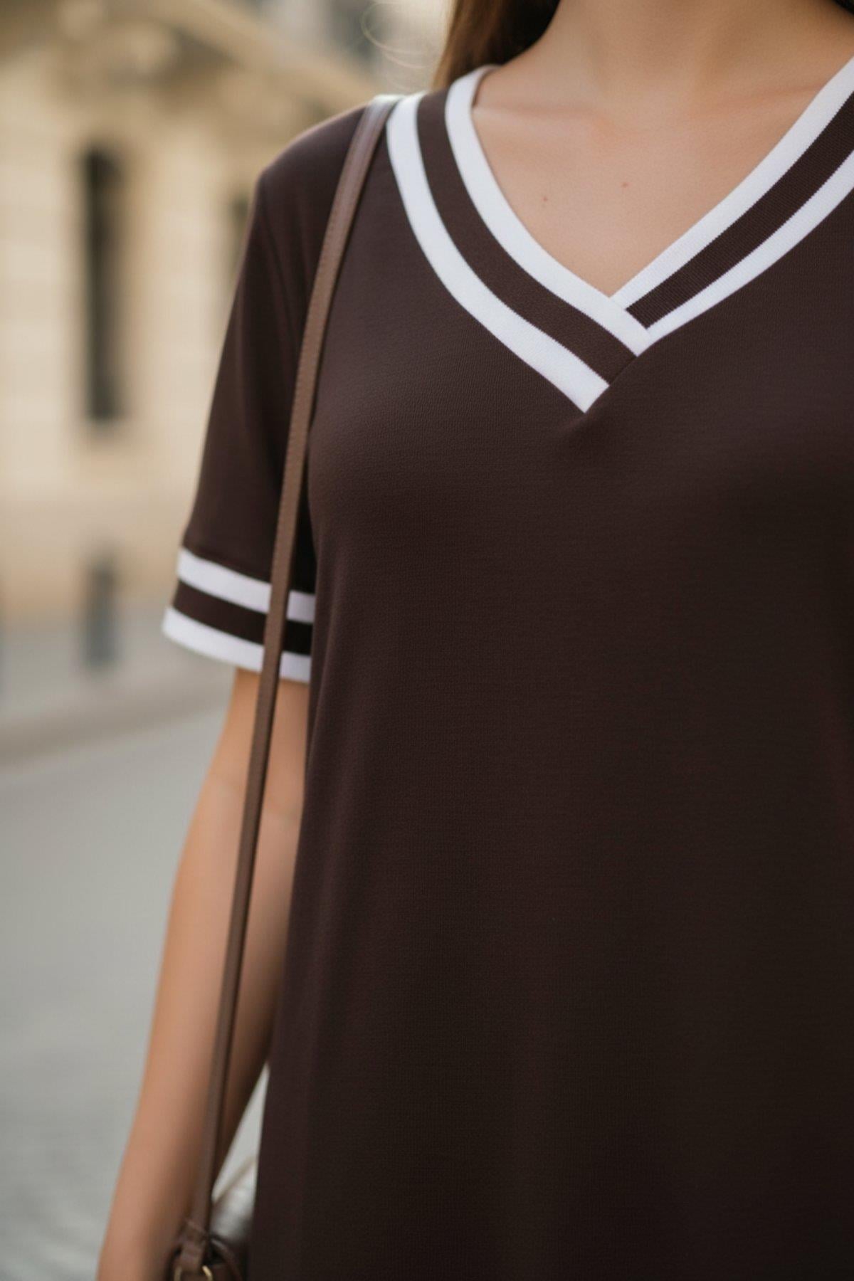 Kısa Kollu V Yaka Kol Ve Yaka Ribana Detay Midi Boy Viskon Elbise - Kahve (JS72094-KAHVE)