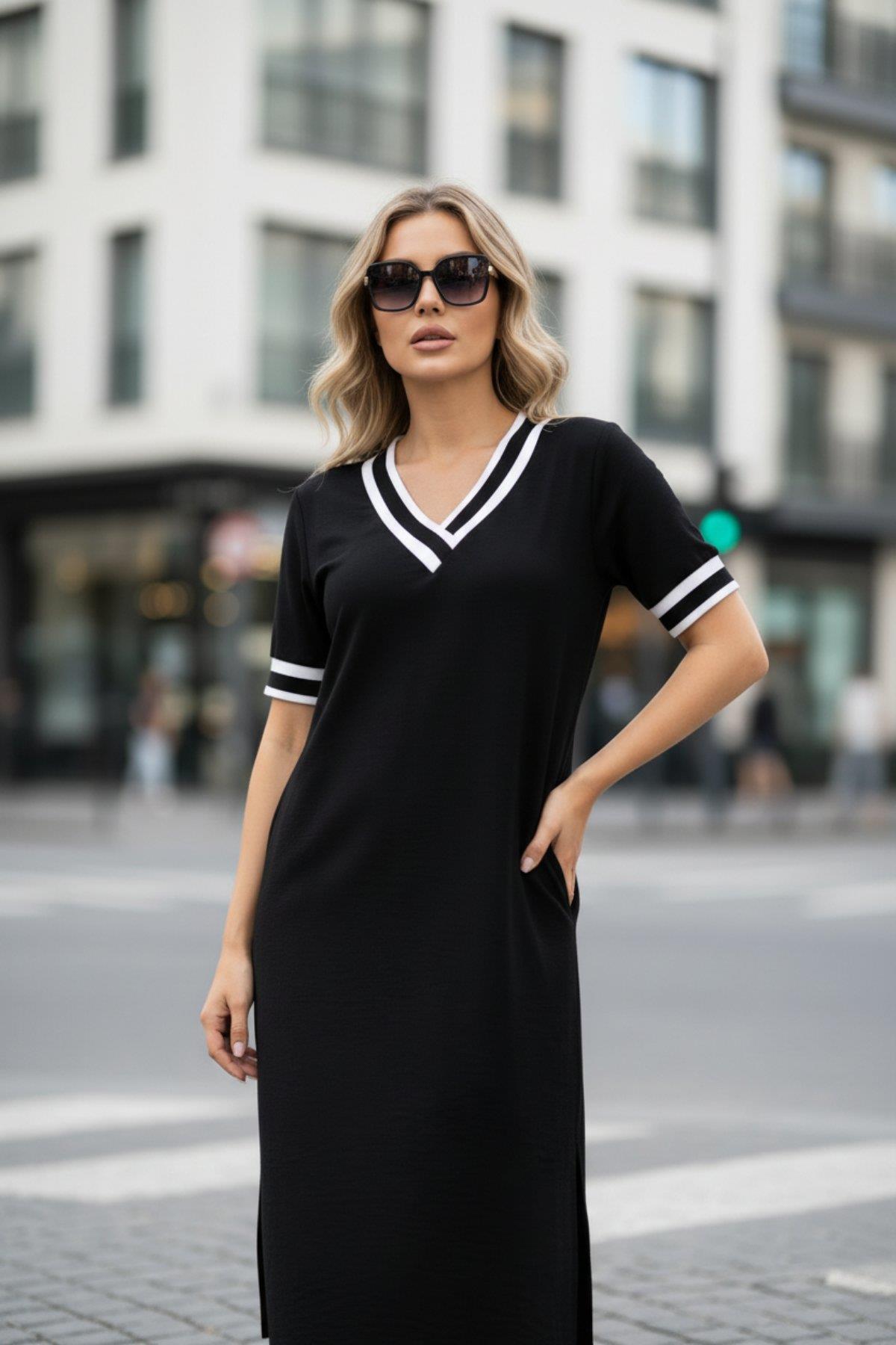 Kısa Kollu V Yaka Kol Ve Yaka Ribana Detay Midi Boy Viskon Elbise Siyah