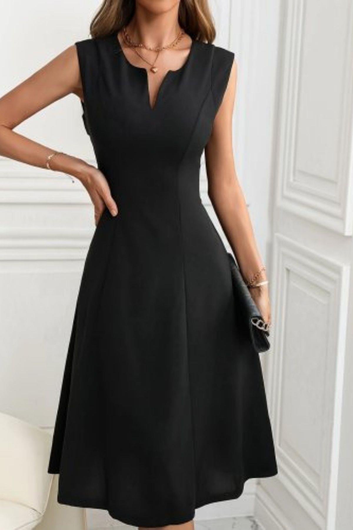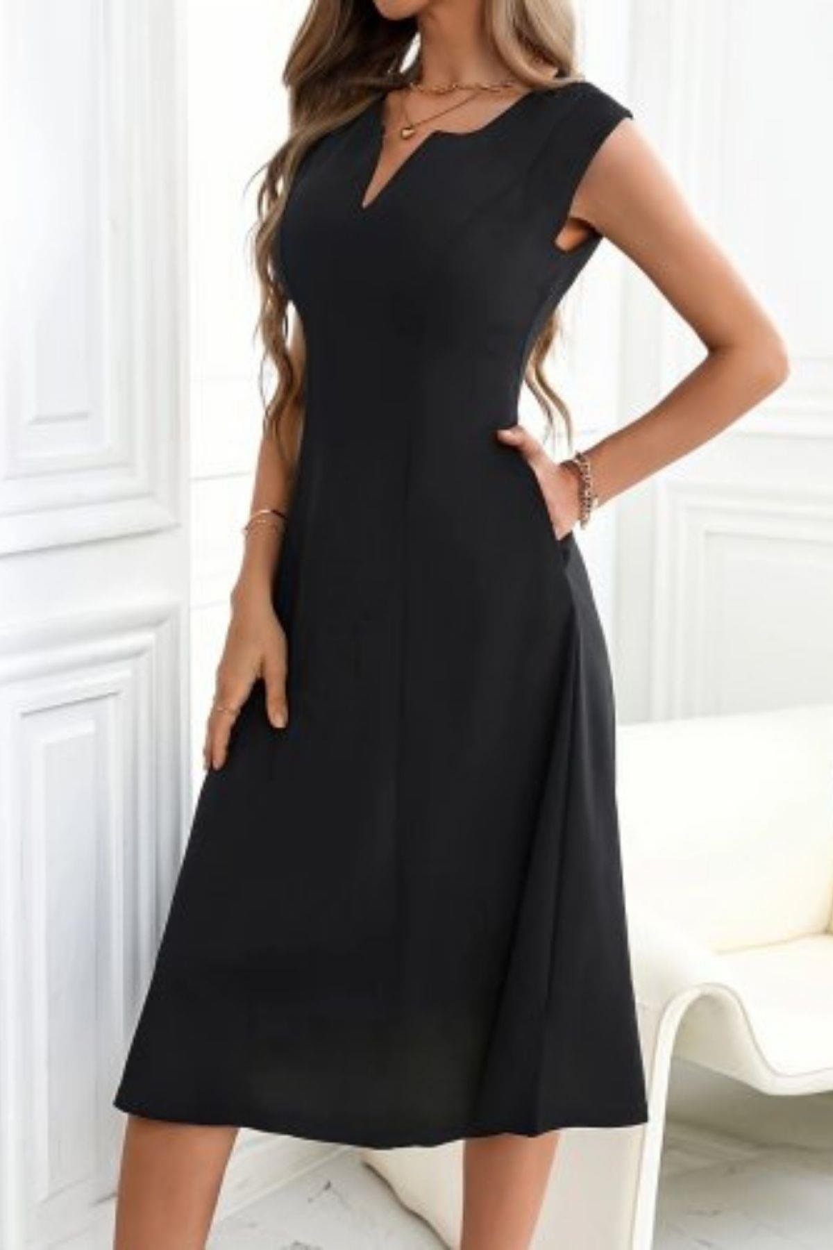 Kolsuz V Yaka Midi İthal Krep Elbise - Siyah (JS97099-SİYAH)