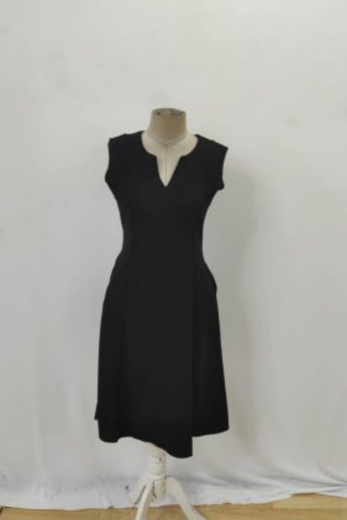 Kolsuz V Yaka Midi İthal Krep Elbise - Siyah