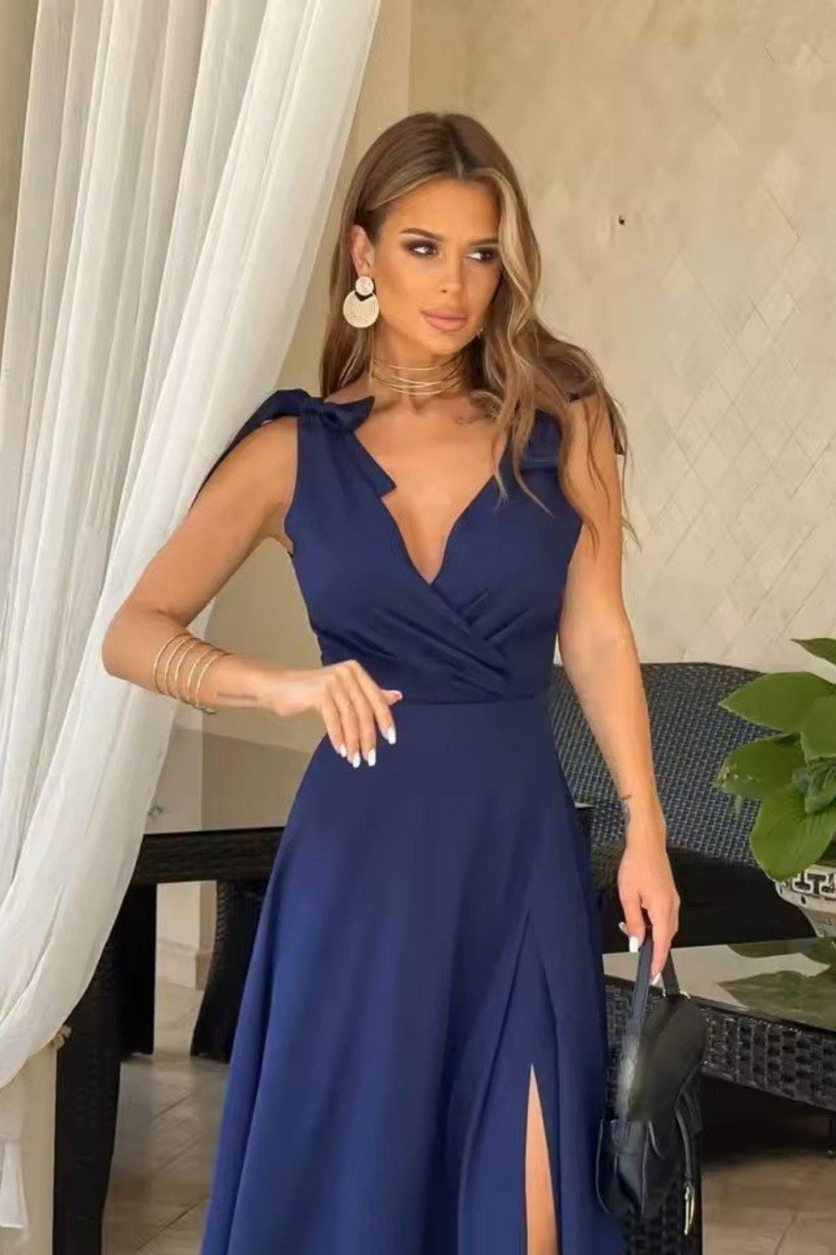 Bu şık lacivert abiye, özel davetleriniz ve gece etkinlikleriniz için mükemmel bir tercih. Derin V yaka ve omuzları süsleyen bağcık detayları, zarif bir görünüm sunarken, yüksek yırtmaçlı uzun etek kısmı hareketli ve feminen bir silüet yaratır. Belden oturan kesimi sayesinde vücut hatlarınızı kusursuzca sergiler. Hafif ve dökümlü kumaşı, hem rahatlık hem de şıklık sağlar. Bu elbiseyi topuklu sandaletler ve parlak takılarla kombinleyerek tüm bakışları üzerinize çekebilirsiniz. Mezuniyet, nişan, düğün veya özel bir akşam yemeği için idealdir.