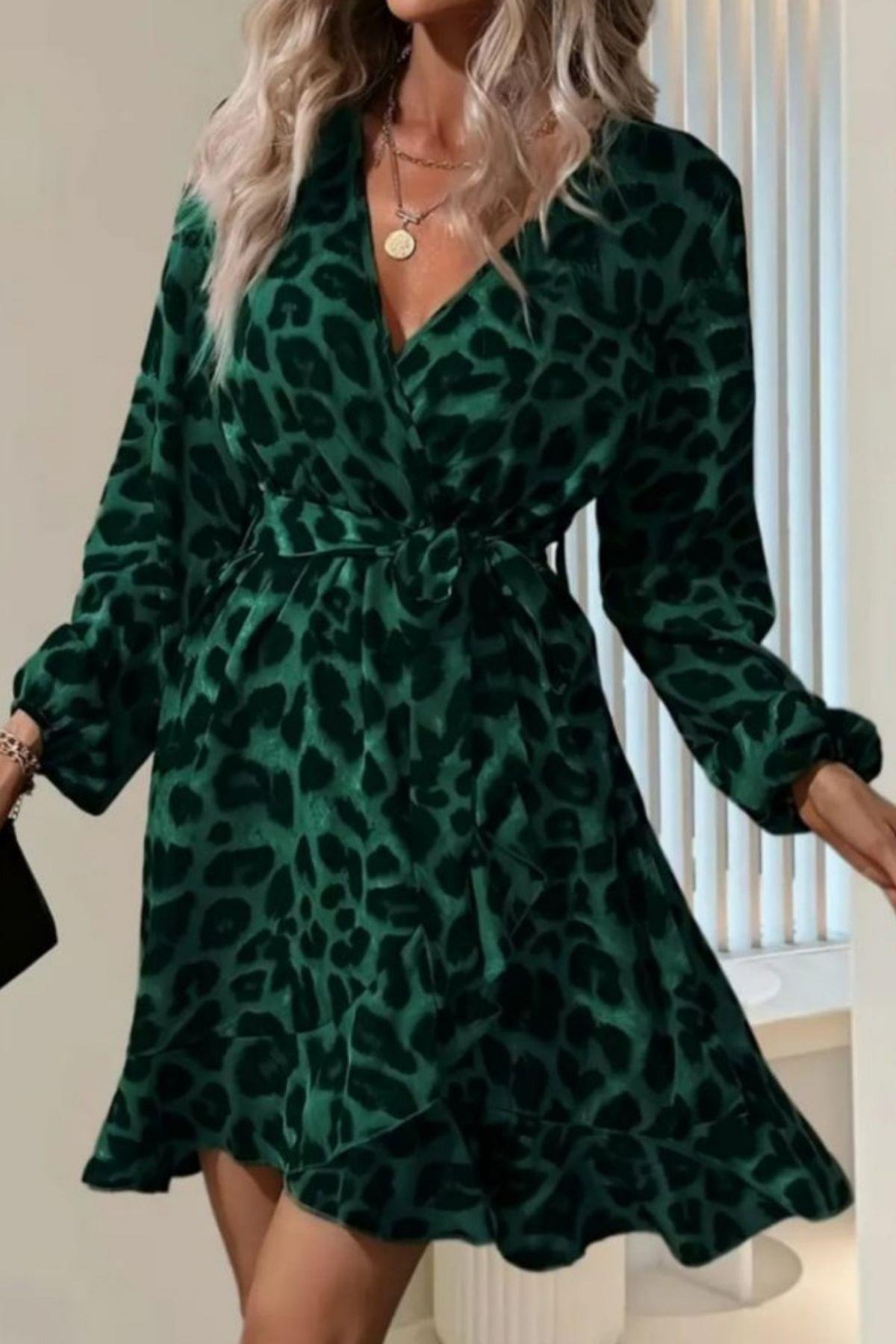 Uzun Kollu Desenli Kruvaze Yaka Beli Bağlamalı Fırfırlı Mini Elbise