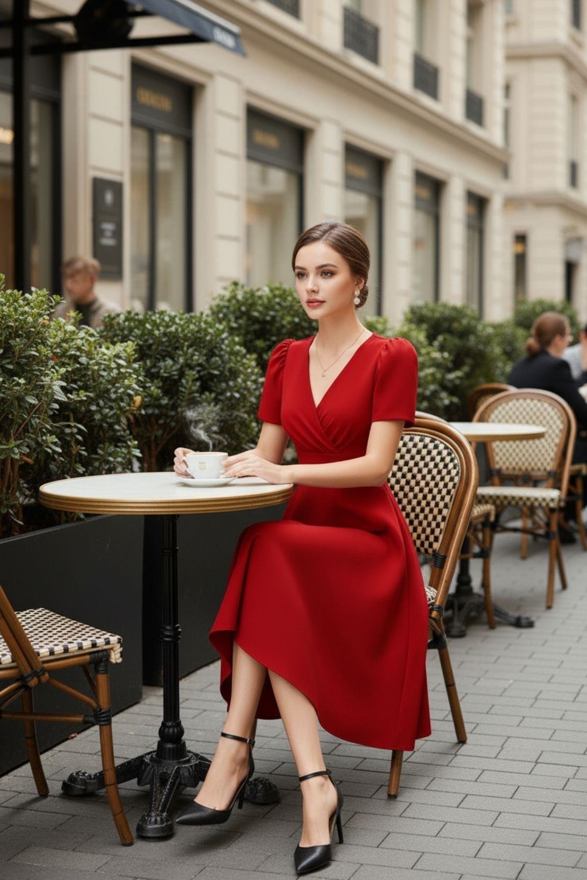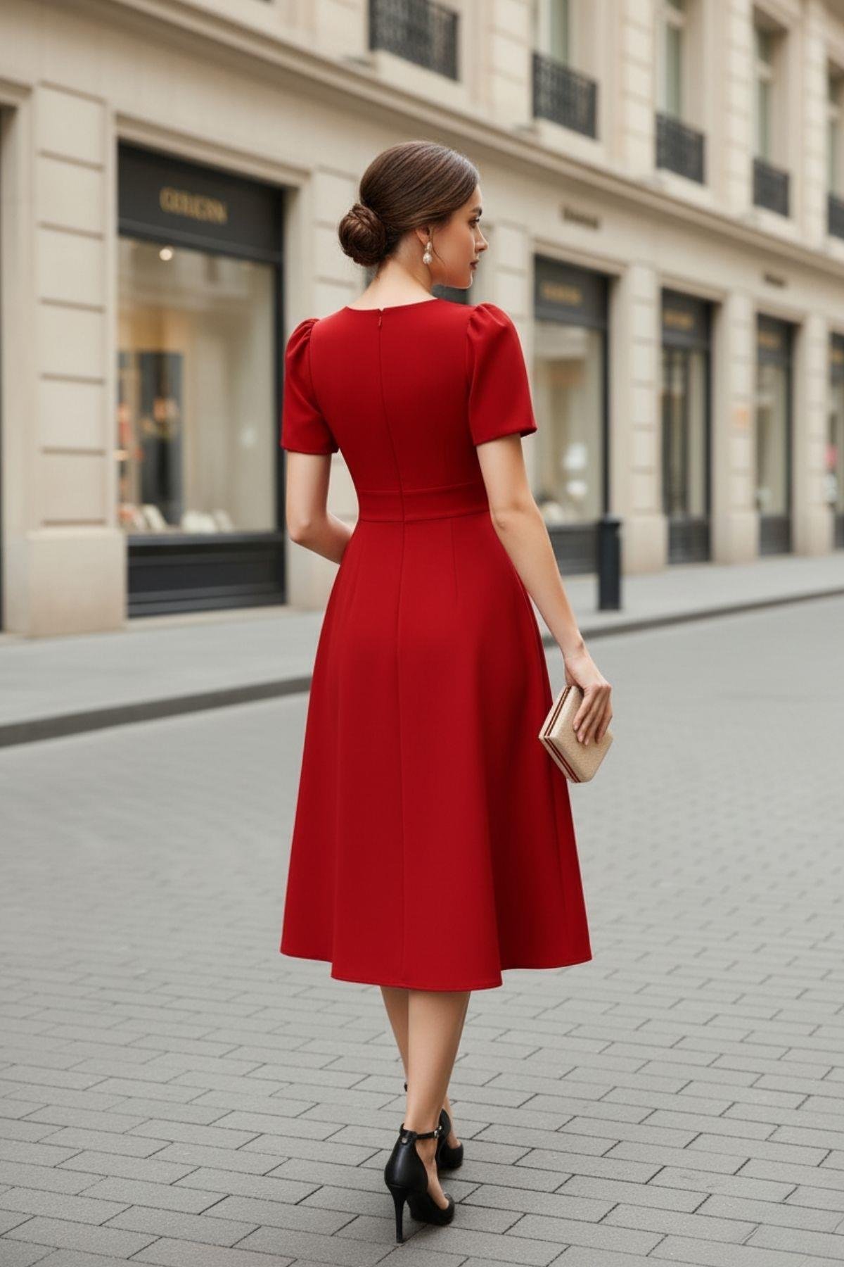 Kırmızı Kısa Kollu V Yaka Kruvaze Midi Elbise – Modern Şık Kadın Elbisesi