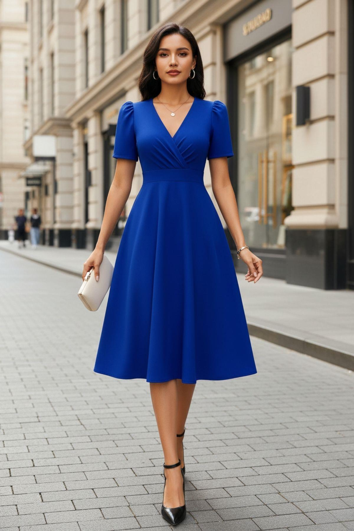Saks Mavisi Kruvaze Midi Elbise V Yaka Kısa Kollu Modern Şık Elbise