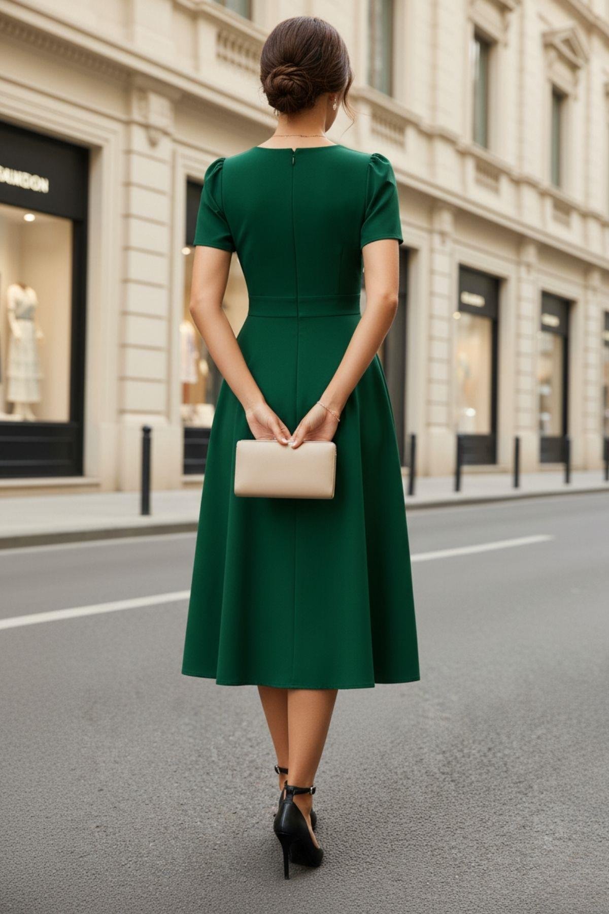 Yeşil Kloş Midi Elbise V Yaka Kruvaze Kesim Şık Günlük Elbise
