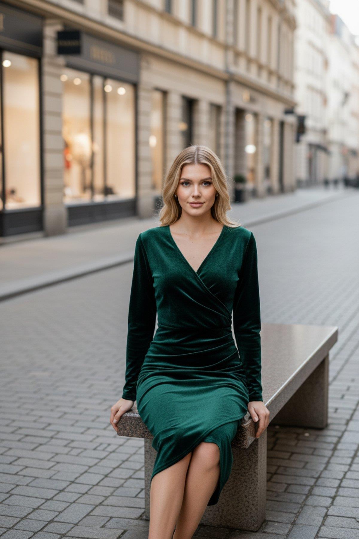 Kruvaze Yaka Bel Büzgü Detay Midi Kadife Elbise Yeşil