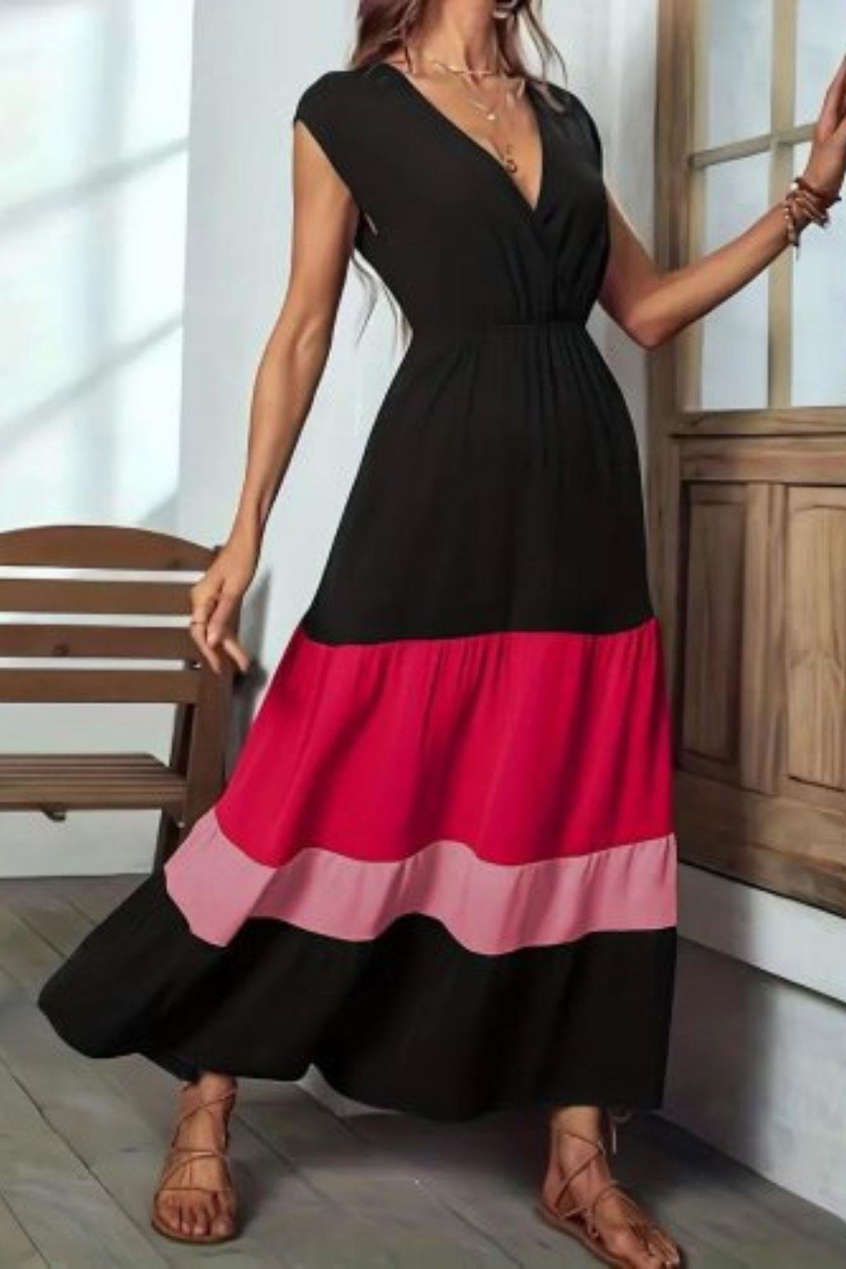 Renkli blok tasarımıyla dikkat çeken bu V yaka, kısa kollu maksi elbise ile stilinize dinamik bir enerji katın! Canlı renk geçişleriyle modern ve cesur bir görünüm sunan bu elbise, gardırobunuza neşe katacak. V yaka kesimi feminen bir dokunuş sağlarken, kısa kolları ve beli saran büzgü detayı ile konforlu ve şık bir siluet oluşturur. Aşağıya doğru genişleyen rahat kesimi sayesinde gün boyu hareket özgürlüğü sunar. Gündüzden geceye kolayca adapte edebileceğiniz bu elbise, tatil valizinizin ve yazlık kombinlerinizin vazgeçilmezi olacak. Sandaletler veya spor ayakkabılarla tamamlayarak kendi tarzınızı yaratın.
