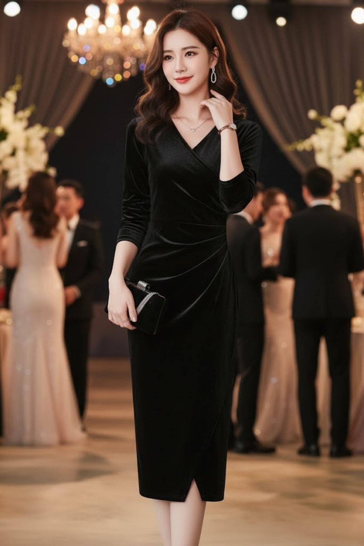 Kruvaze Yaka Büzgülü Midi Kadife Elbise - Siyah