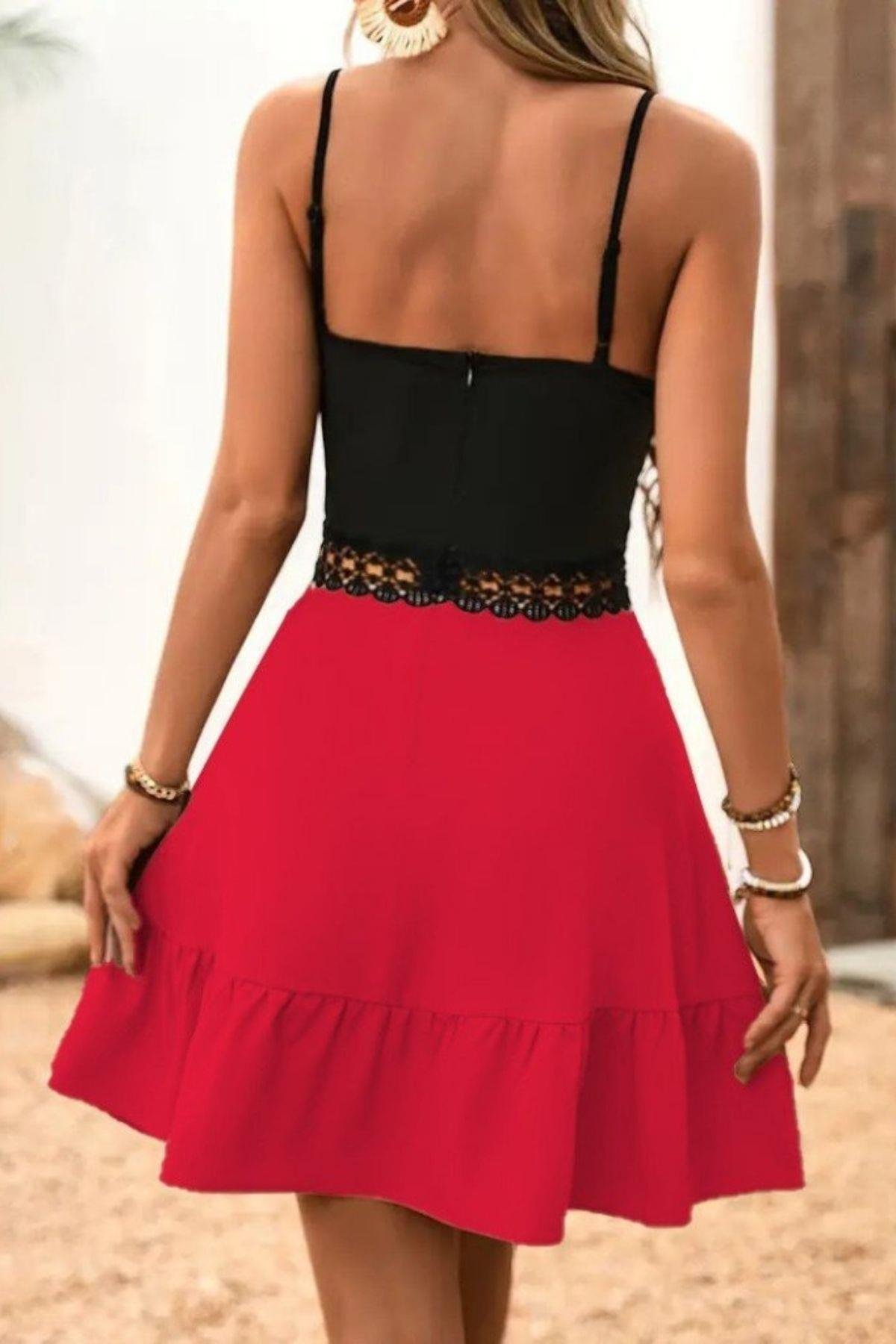 Feminen çizgilerle tasarlanmış bu özel model, askılı yapısı ve dantel detaylı beliyle göz alıcı bir duruş sunar. Alt kısmındaki volanlı etek hareket özgürlüğü ve zarafeti bir araya getirirken, üst bölümdeki derin V yaka feminen bir siluet yaratır.