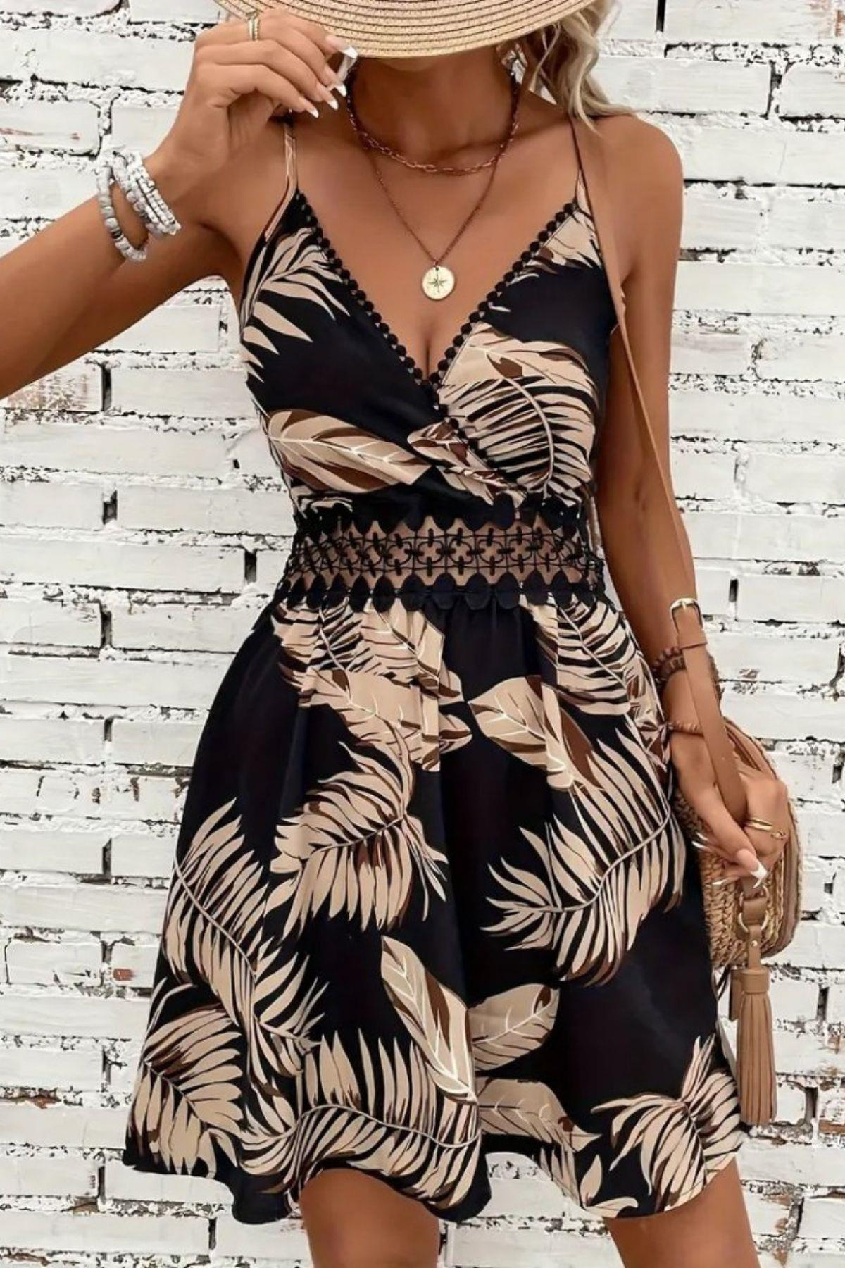 Sıcak havaların enerjisini yansıtan bu tropikal desenli askılı mini elbise, yaz gardırobunuzun en şık ve rahat parçası olmaya aday. Vücudu saran V yaka kruvaze kesimi, ince ayarlanabilir askılarıyla modern bir görünüm sunar. Beli saran büzgülü ve dantel detaylı lastikli bel tasarımı, hem konfor sağlar hem de siluetinizi vurgular. Hafif ve dökümlü kumaşı sayesinde gün boyu rahatlıkla giyebilirsiniz. Plajdan yaz partilerine, tatil akşamlarından günlük kombinlere kadar her ortama uyum sağlar.