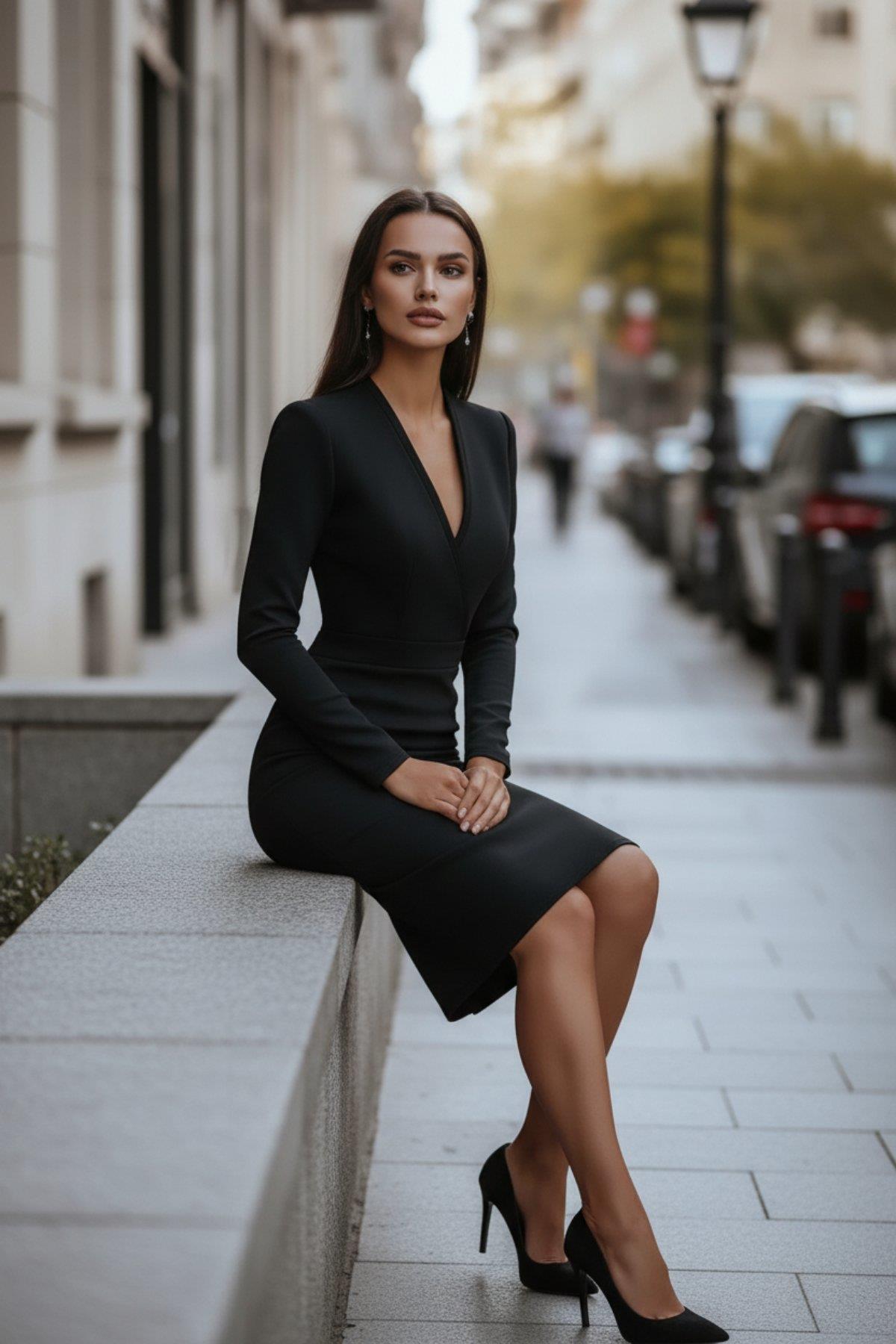 Zarafet ve profesyonelliği bir araya getiren bu kruvaze yaka midi elbise, modern kadının gardırobunda olması gereken zamansız bir parçadır. Derin V yaka dekoltesi ve vücudu saran kalem kesimi, sofistike bir silüet yaratırken, uzun kolları ve midi boyuyla resmiyetten ödün vermez.