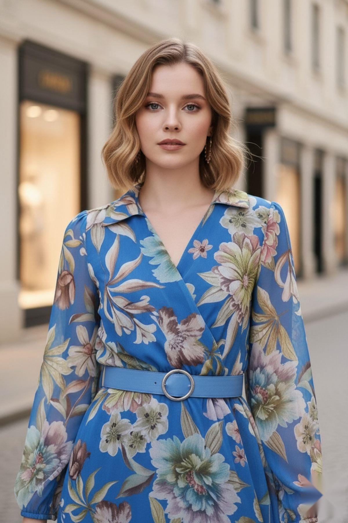 Kruvaze Yaka Kemerli Şifon Uzun Fashion Elbise Mavi