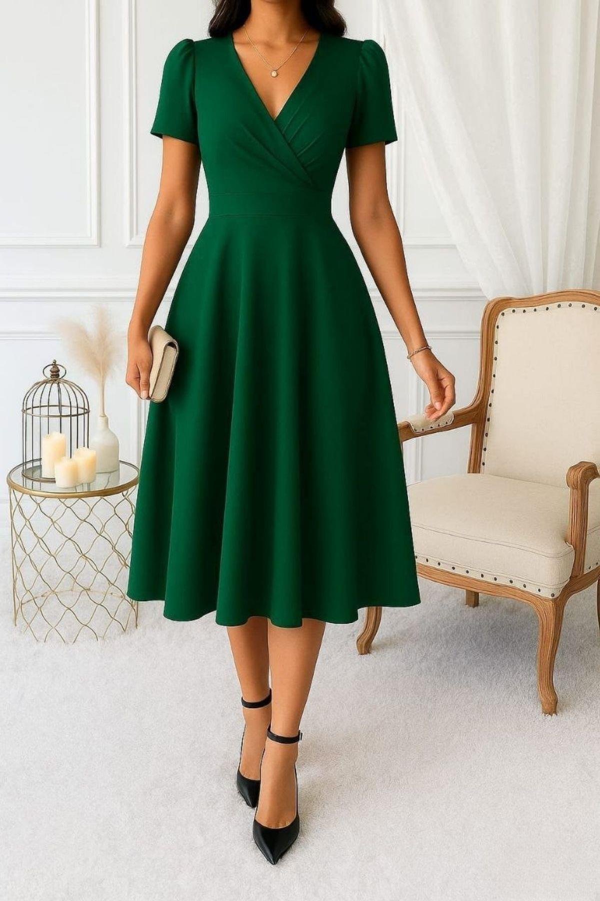 Kruvaze Yaka Kısa Kollu Midi Krep Elbise - Yeşil
