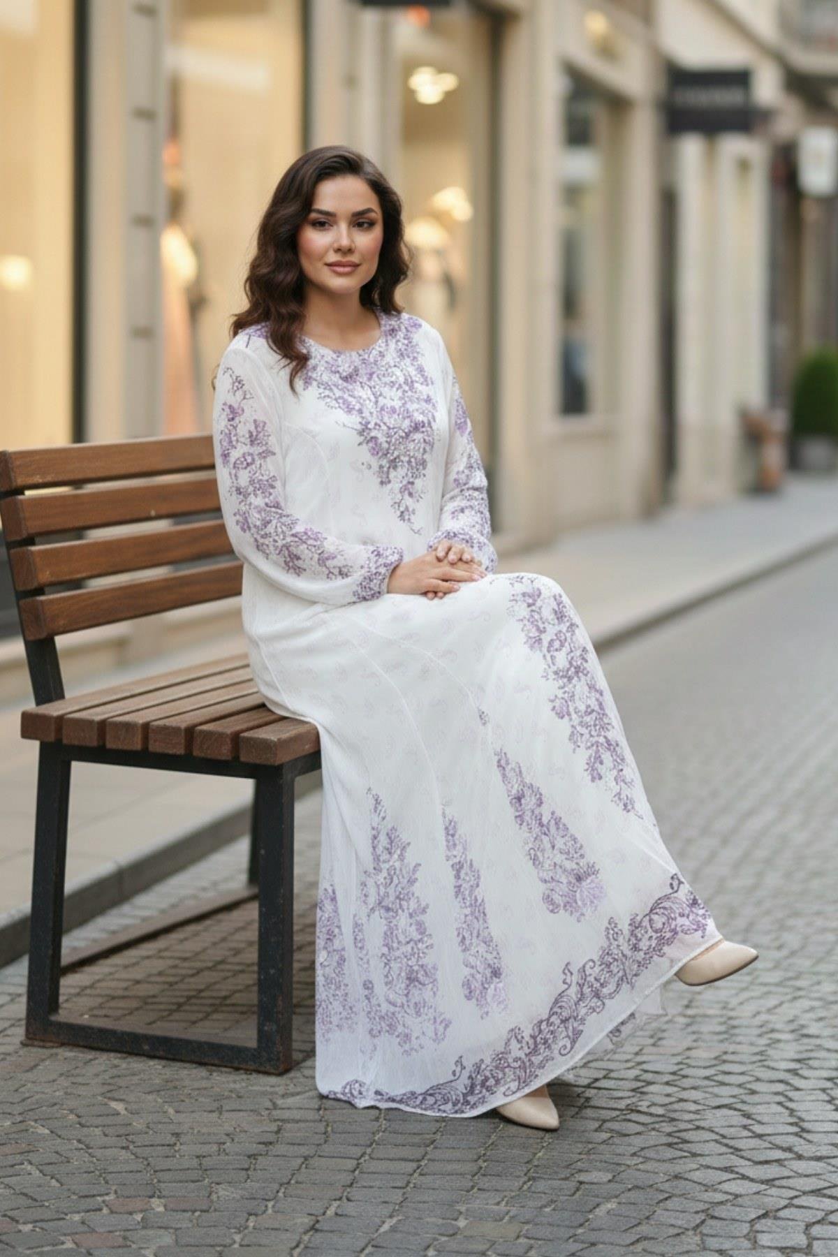 Lila Desenli Astarlı Şifon Maxi Elbise | Uzun Kollu Rahat Kesim (MS5321-BEYAZ)