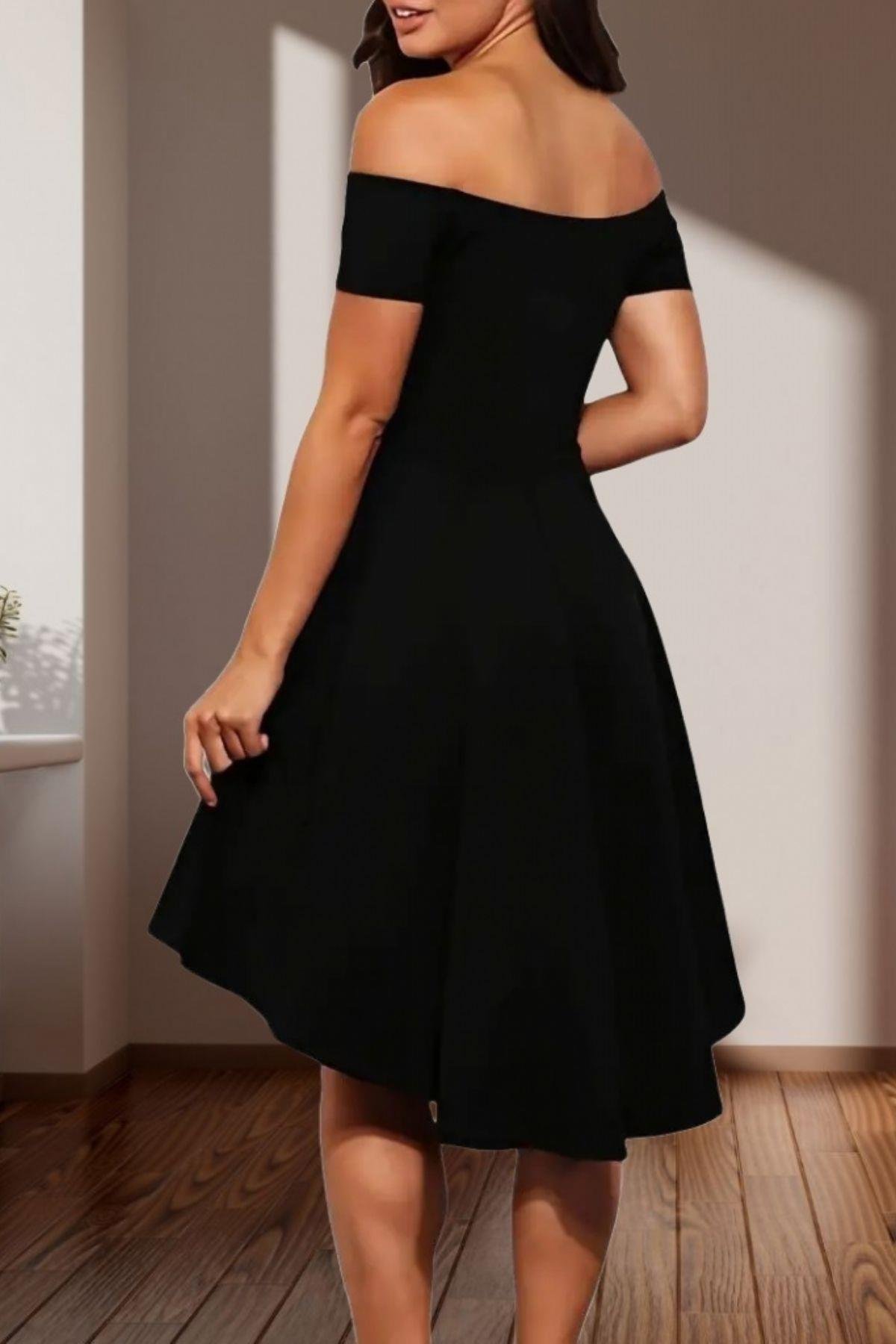 Madonna Yaka Asimetrik Etek Detaylı ithal Krep Elbise - Siyah (JS1464-SİYAH)