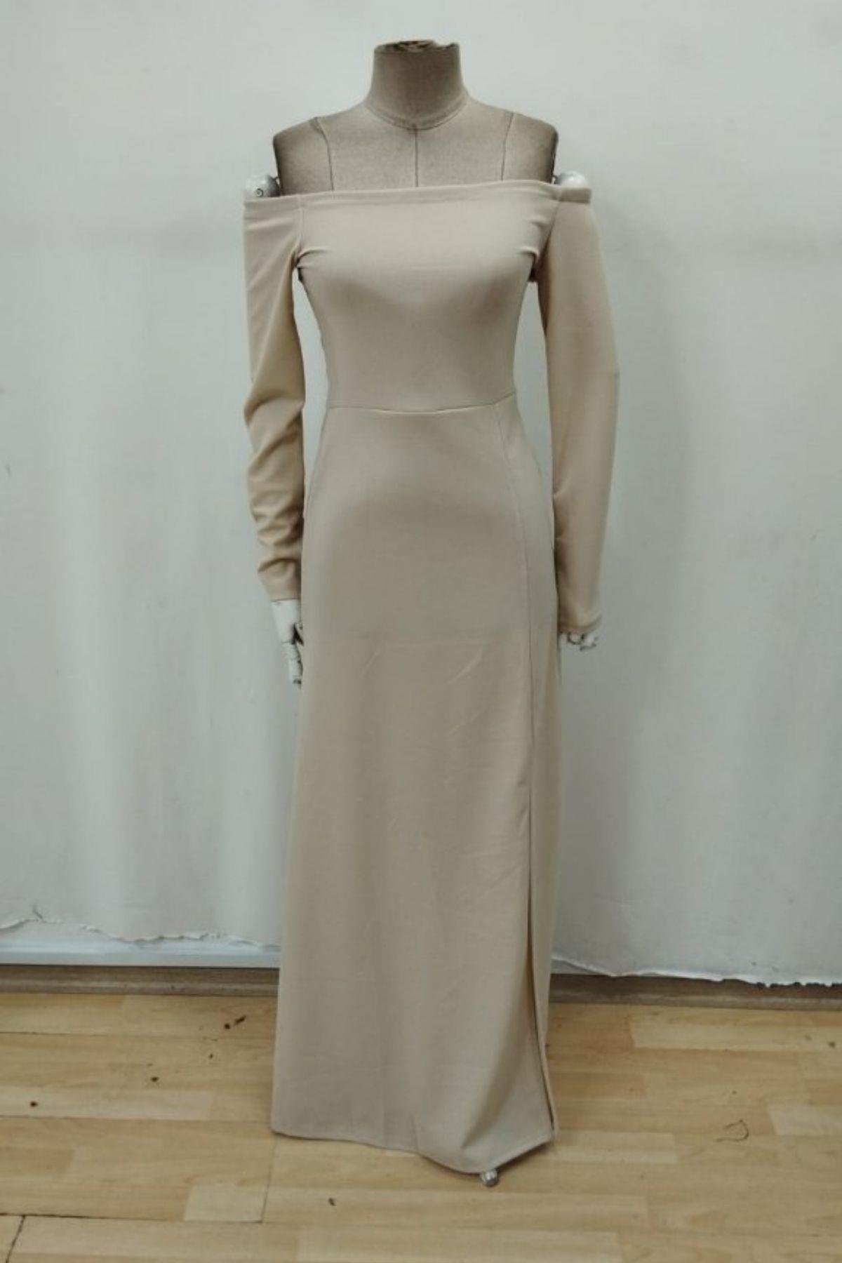 • Tasarım Detayları: Omuz dekolteli (Kayık yaka), yırtmaçlı uzun kesim.