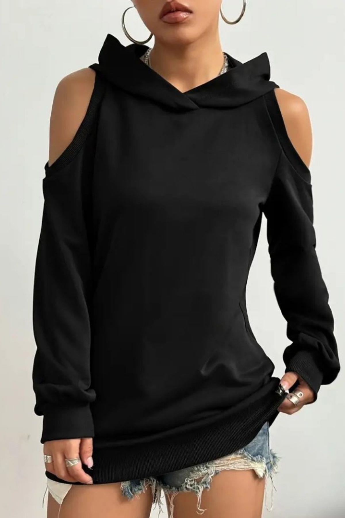 Omuz Açık Kapüşonlu Viskon İki İplik Bluz - Siyah
