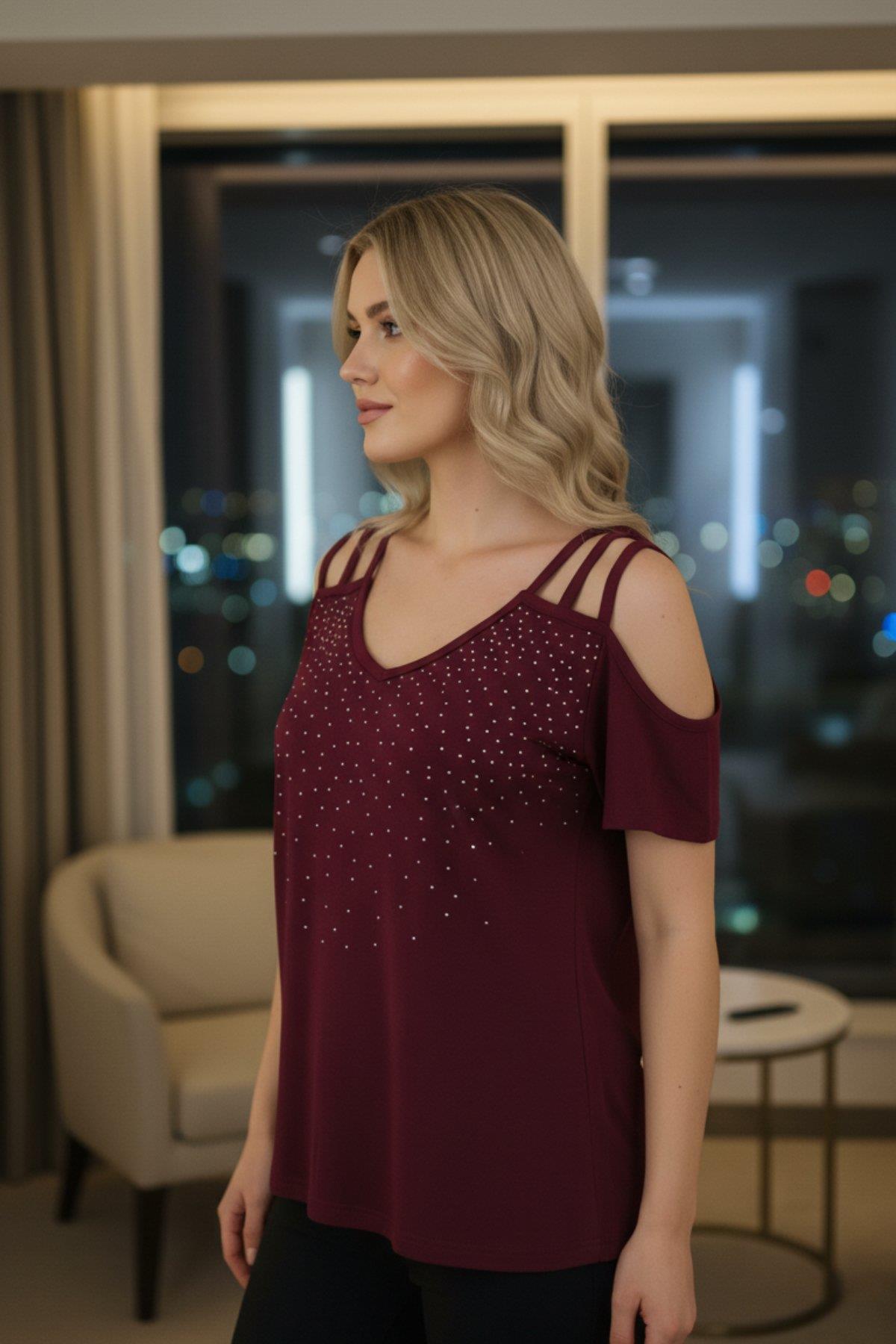 Omuz Pencereli Taş Baskılı Viskon Bluz - Bordo (JS62113-BORDO)