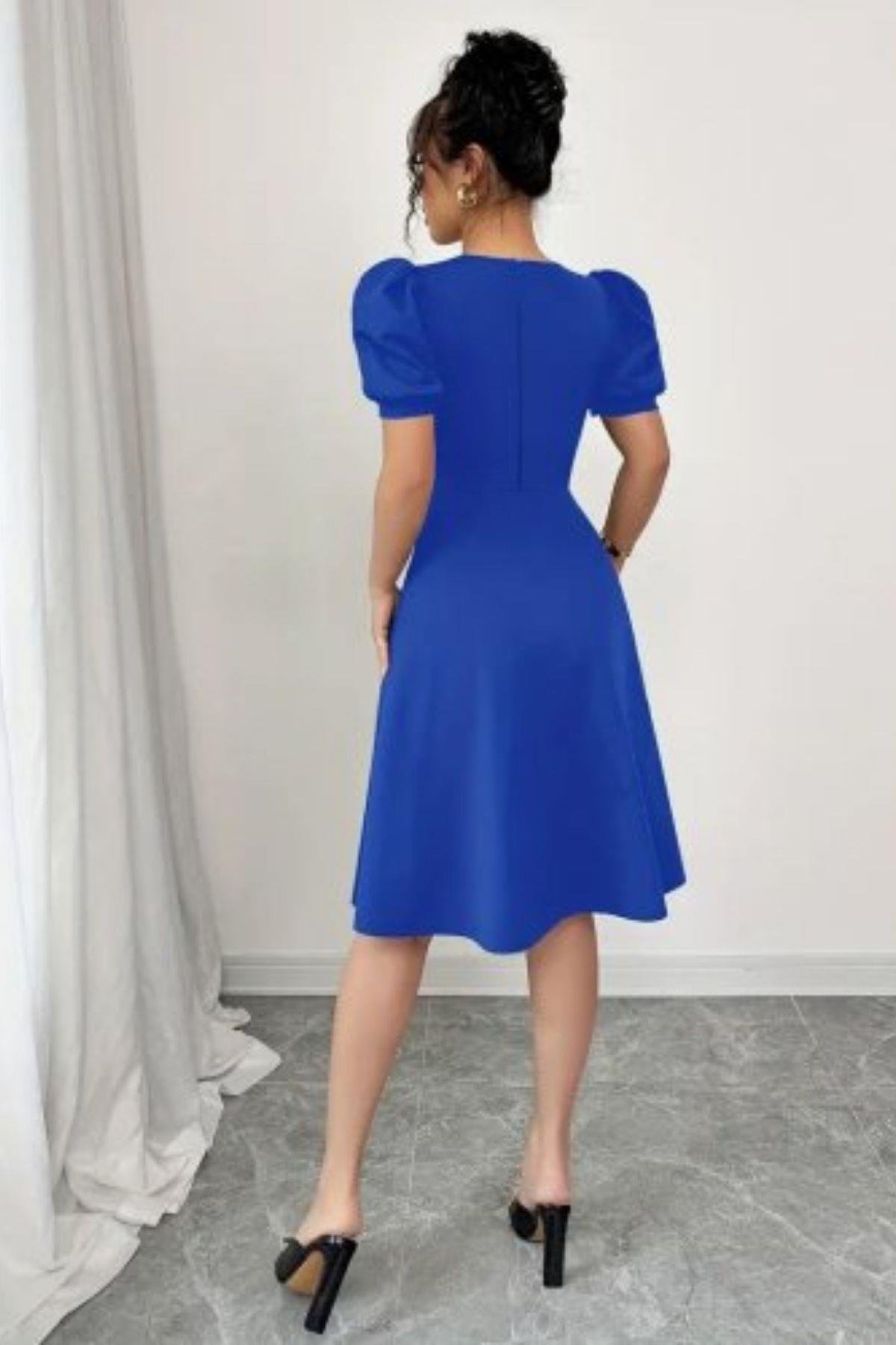 Ön Düğmeli Balon Kollu Midi Krep Elbise - Saks (JS61577-SAKS)
