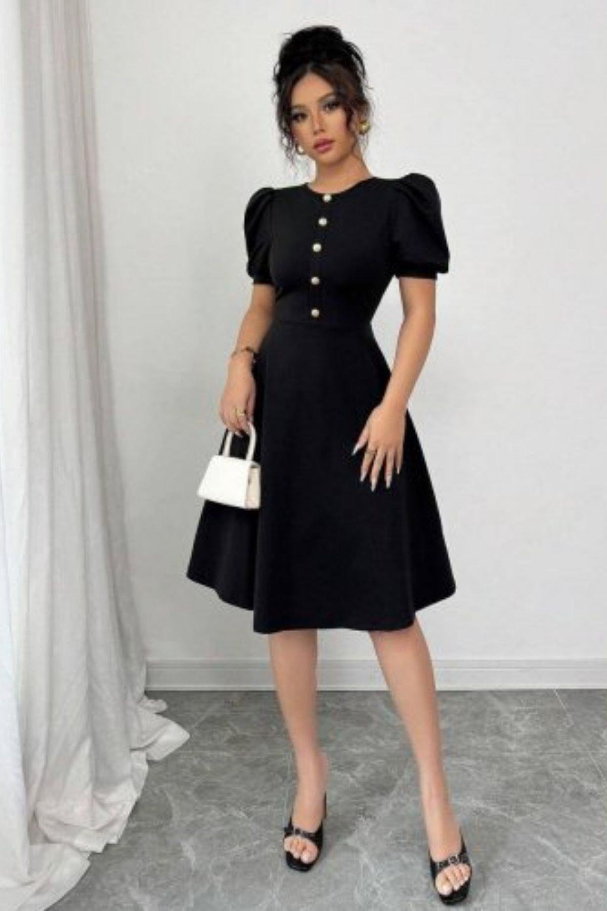 Ön Düğmeli Balon Kollu Midi Krep  Elbise - Siyah