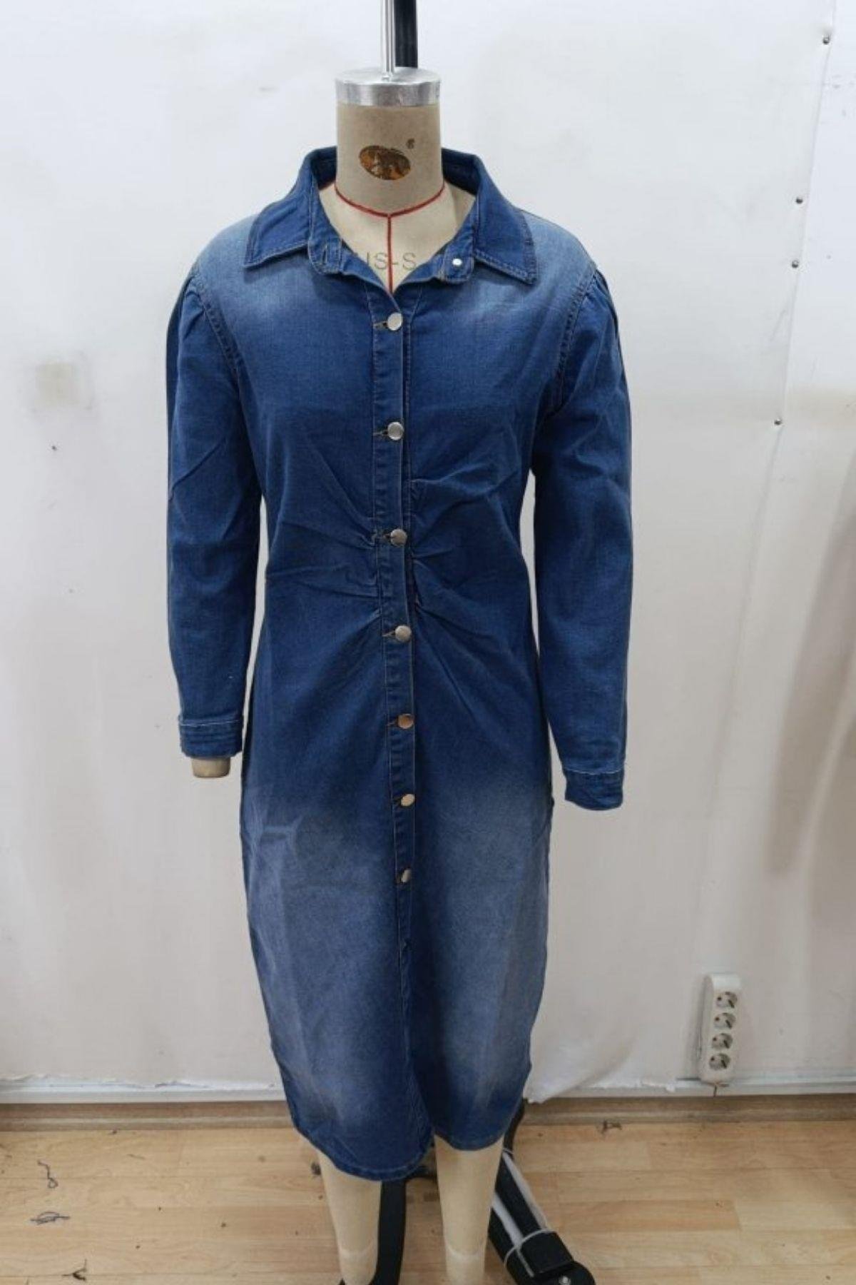 Önden Düğmeli Midi Kot Elbise - Mavi