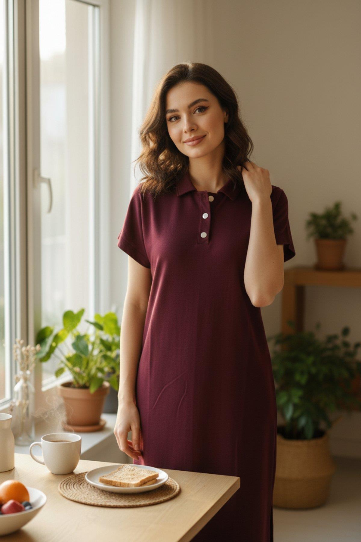 Polo Yaka Düğme Detaylı Yandan Yırtmaçlı  Uzun Elbise - Siyah Polo Yaka Düğme Detaylı Yandan Yırtmaçlı  Uzun Elbise - Bordo
