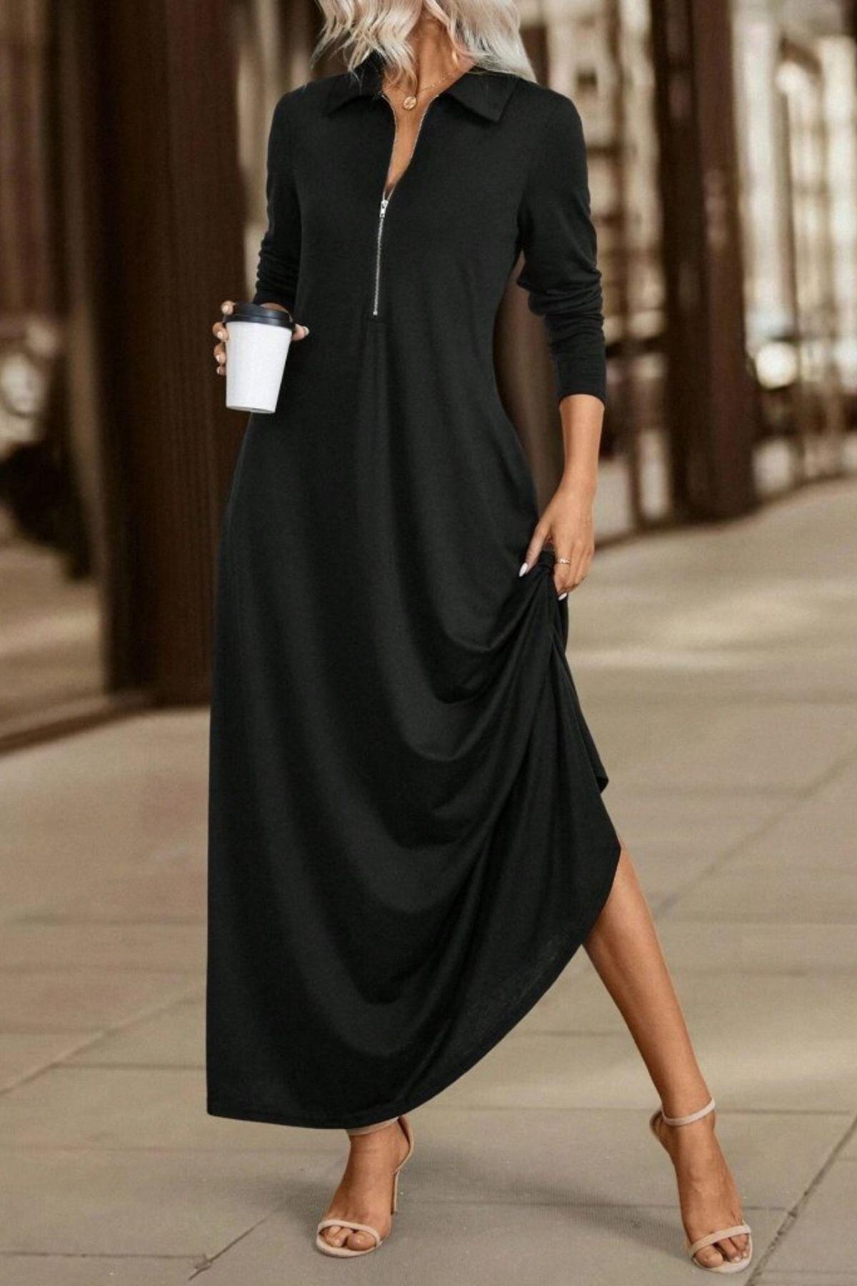 Polo Yaka Fermuar Detaylı Uzun Kollu Maxi Boy Elbise - Siyah