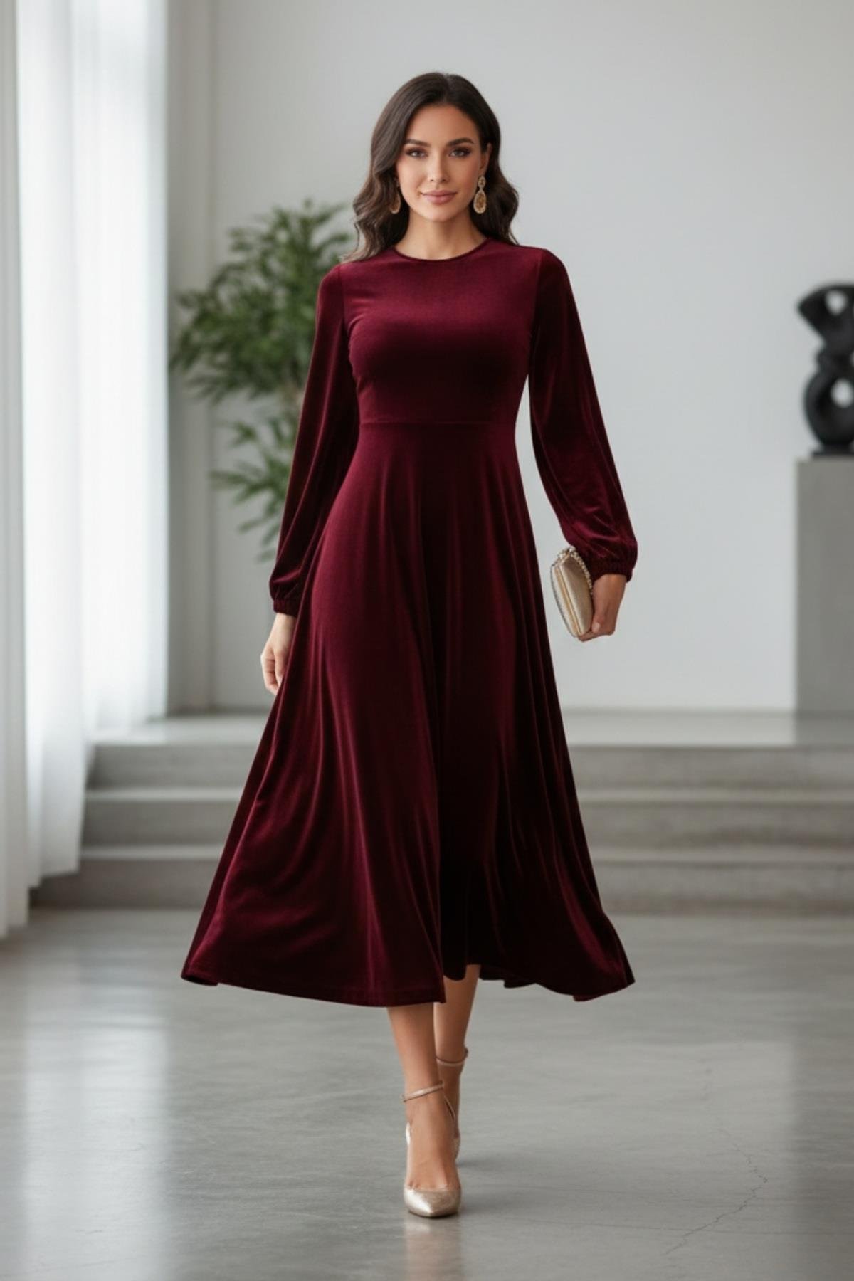 Premium Kadife Midi Siyah Elbise Premium Bordo Kadife Midi Elbise