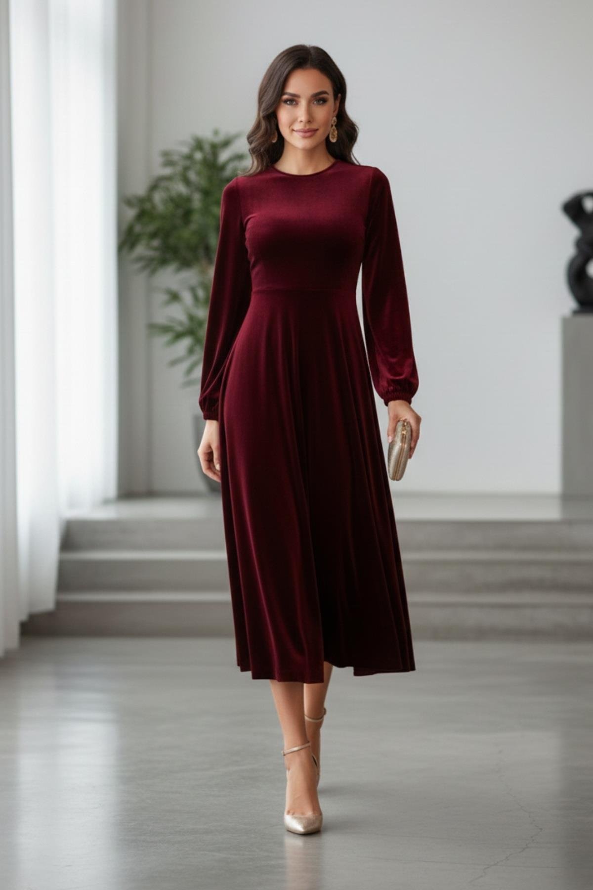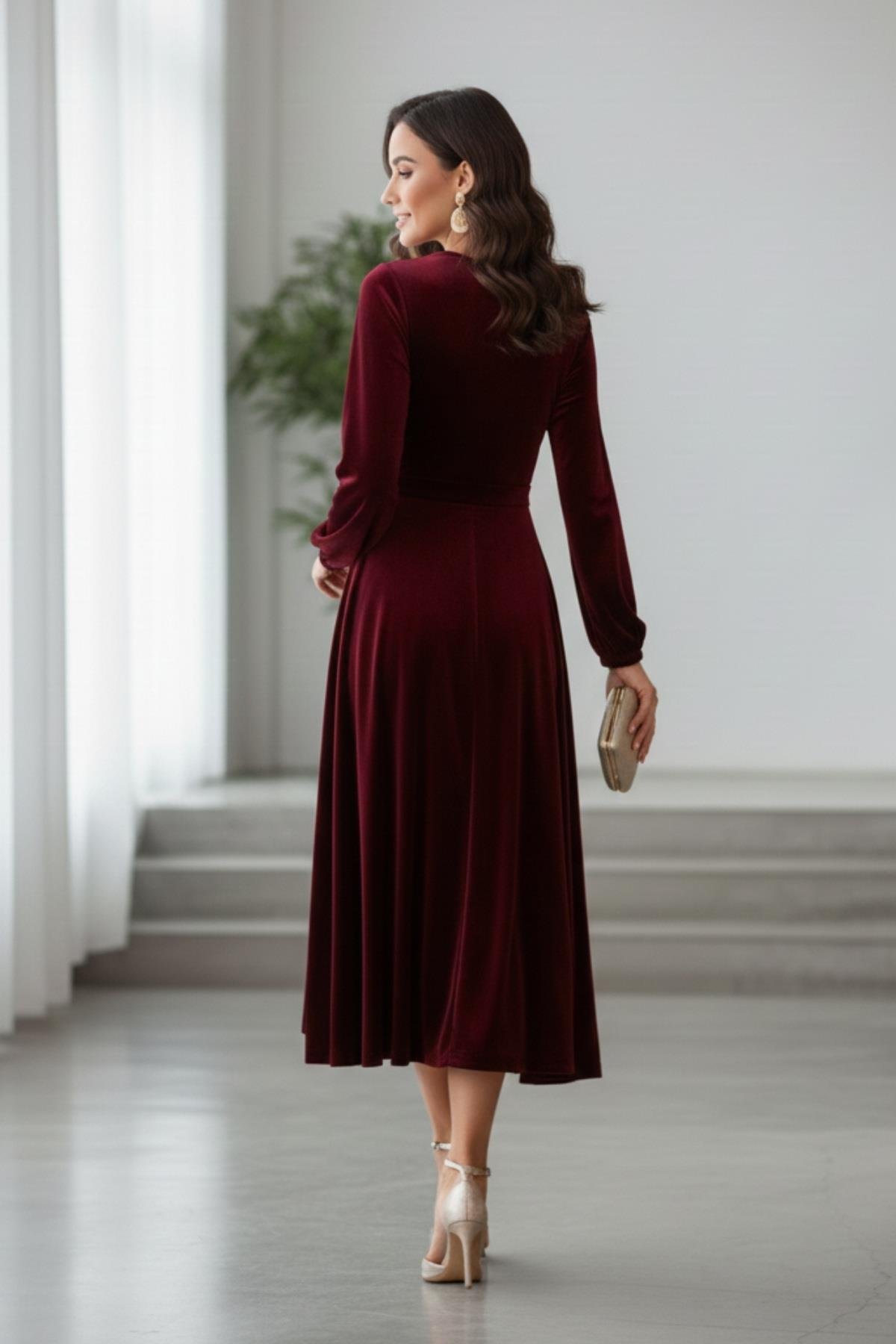 Premium Bordo Kadife Midi Elbise (MS5205-BORDO)