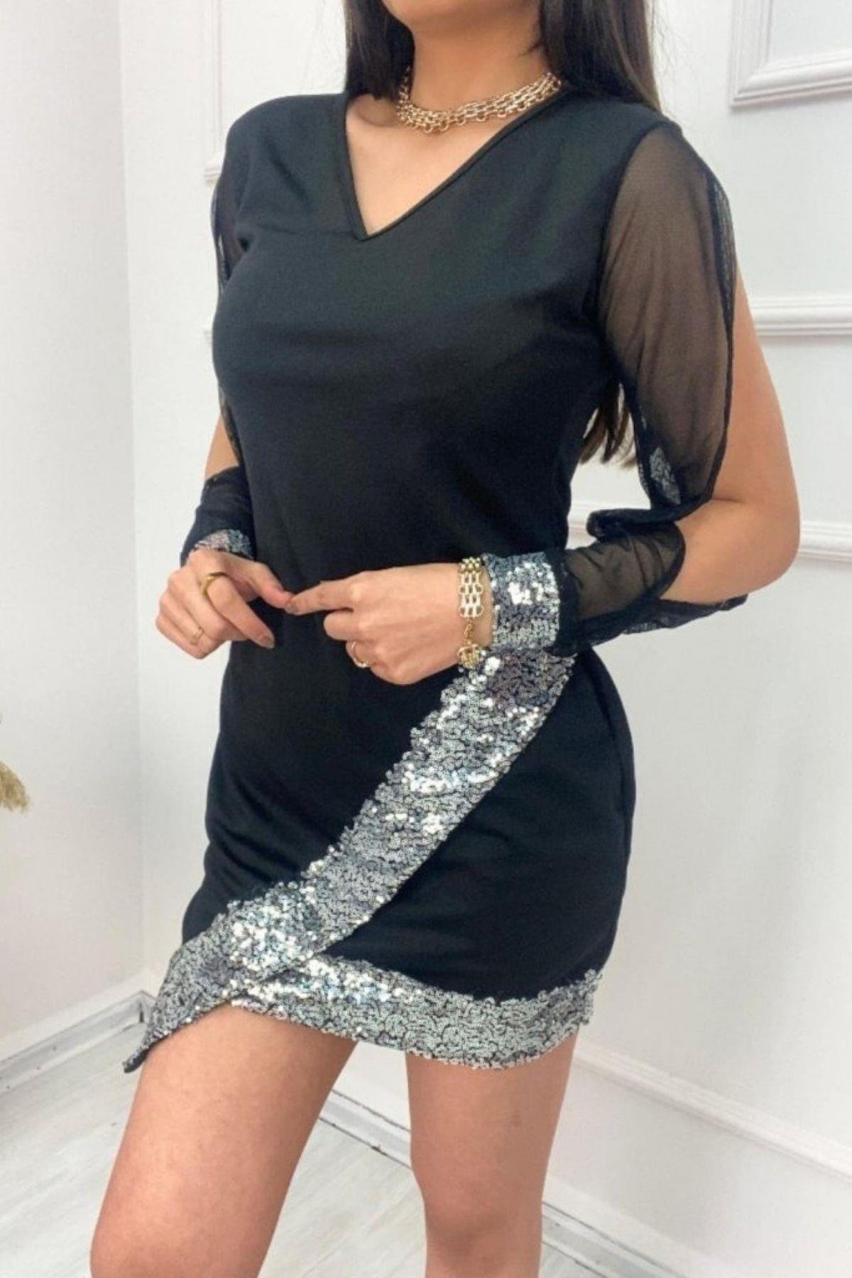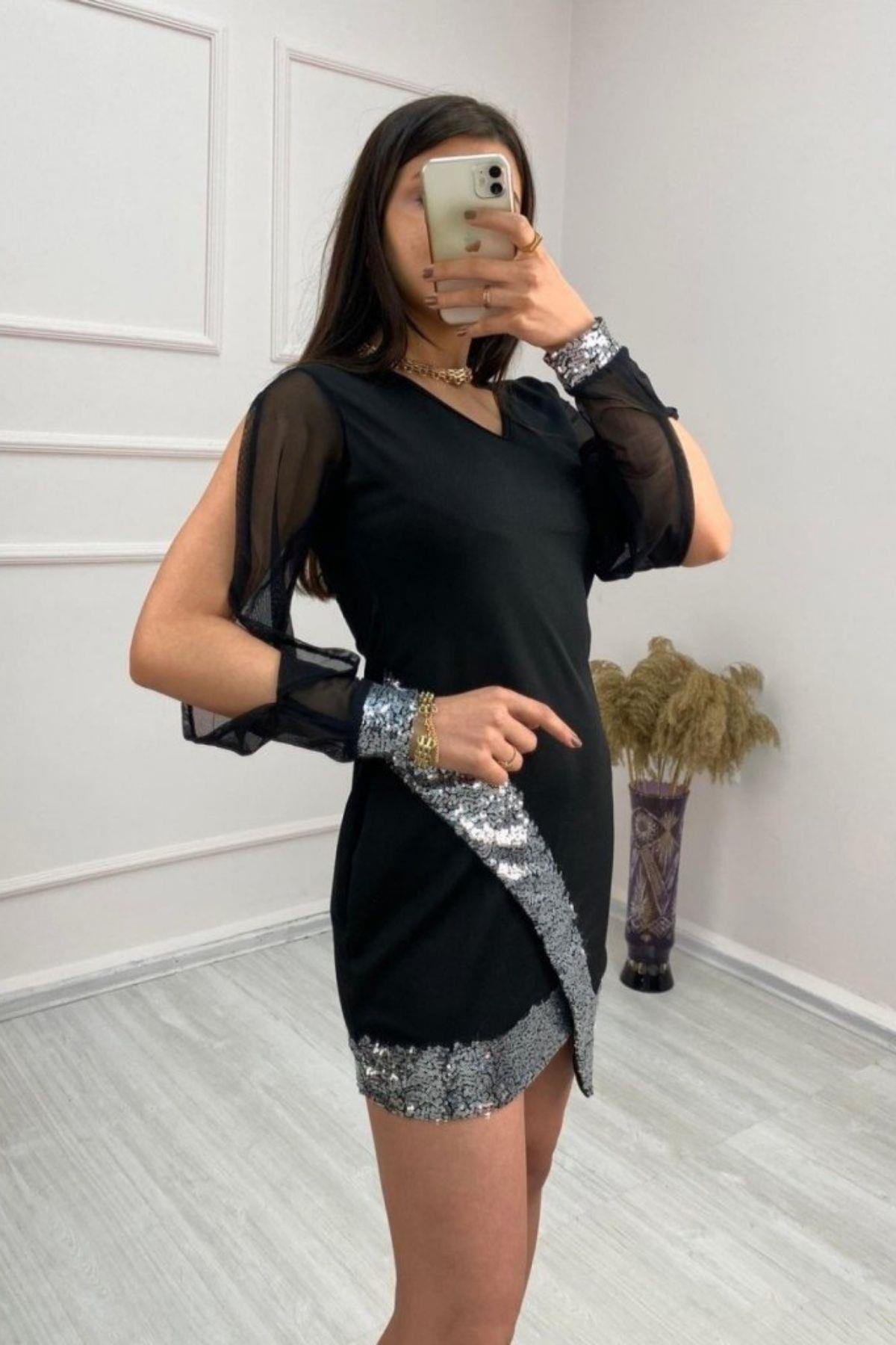 Özel davetlerin, kokteyllerin ve partilerin en çarpıcı parçası! Bu V yakalı mini elbise, vücuda oturan kesimi ve göz alıcı detaylarıyla modern bir zarafet sunuyor. Işığı yansıtan payet işlemeler ve hareketli şifon kol detayları ile tüm dikkatleri üzerinize çekeceksiniz.