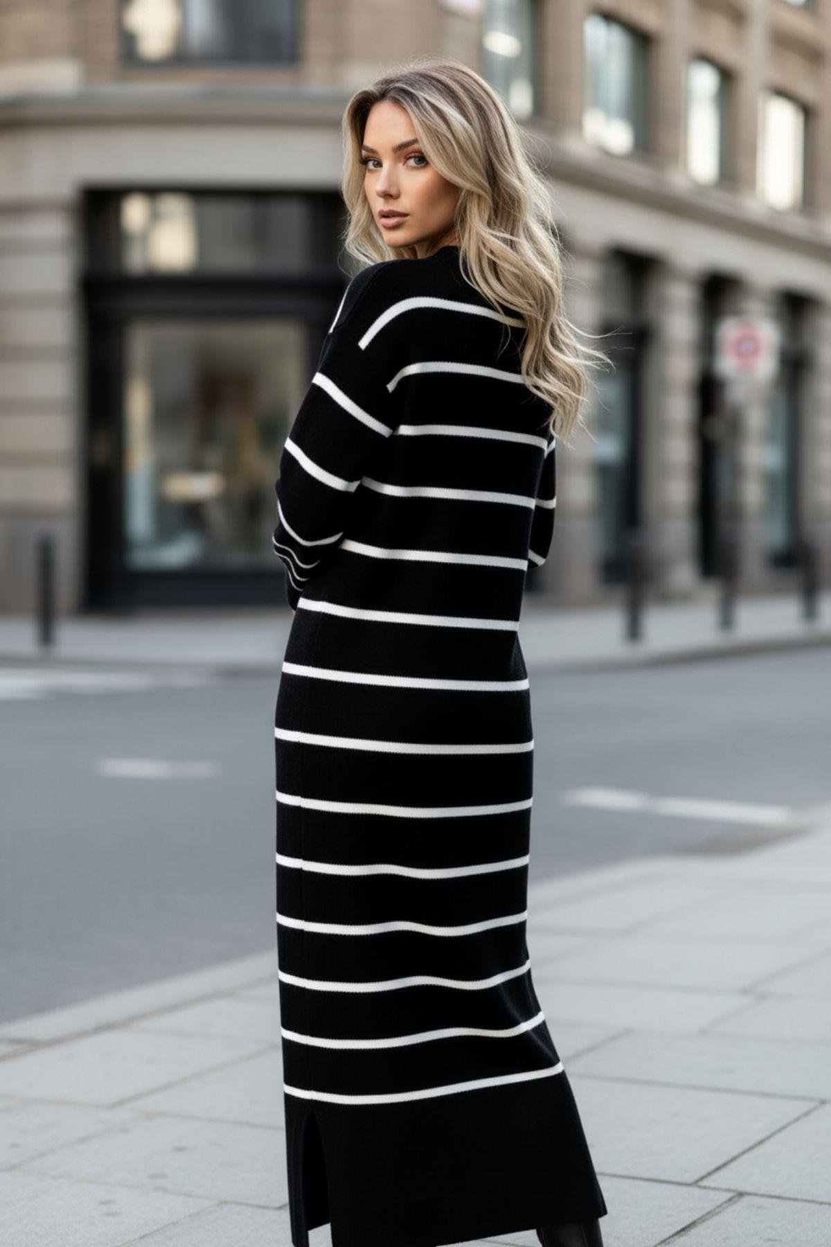 Modern ve zahmetsiz şıklığı bir araya getiren bu uzun, çizgili triko elbise, gardırobunuzun en kullanışlı parçası olmaya aday. Yumuşak dokusu sayesinde sonbahar ve kış aylarında konforunuzdan ödün vermeden stil sahibi bir görünüm yakalamanızı sağlar.