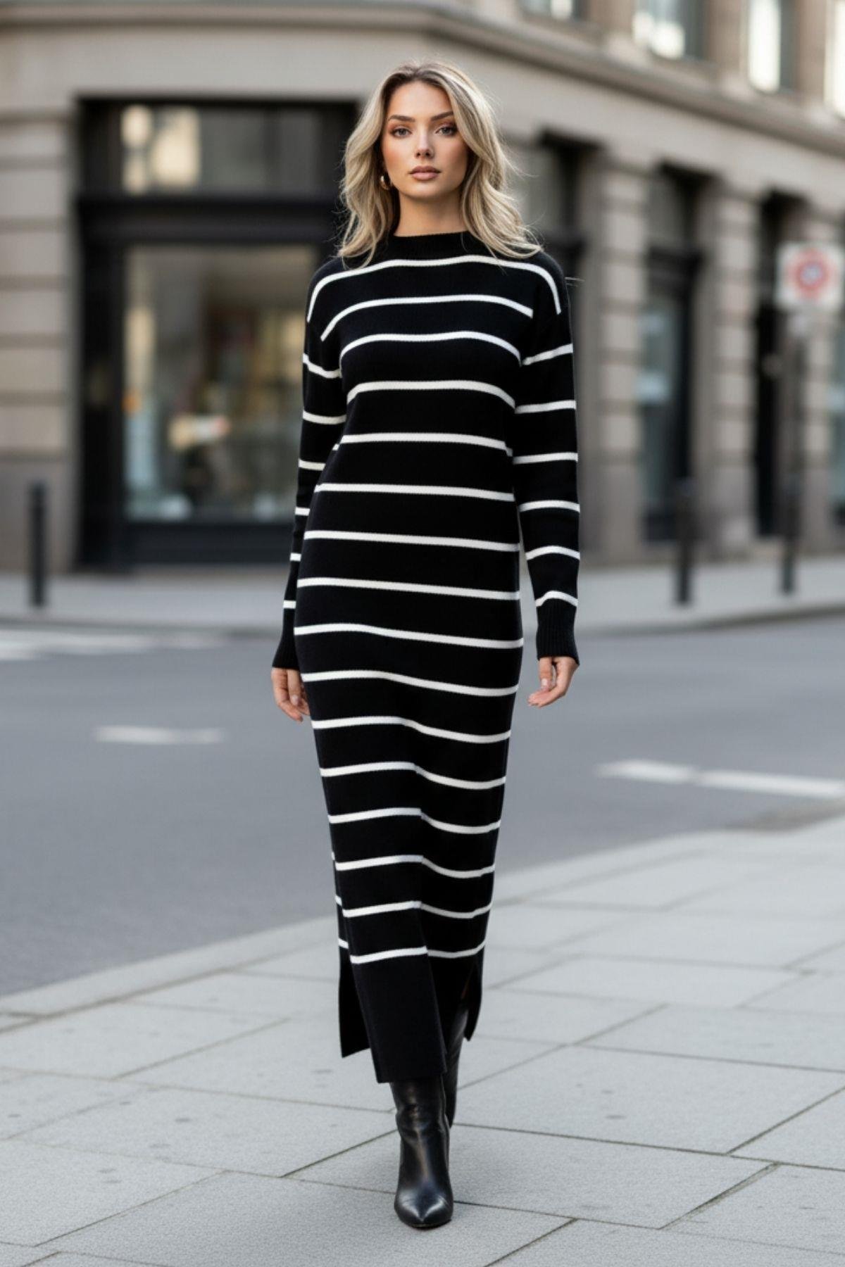 Rahat Çizgili Uzun Triko Siyah Elbise
