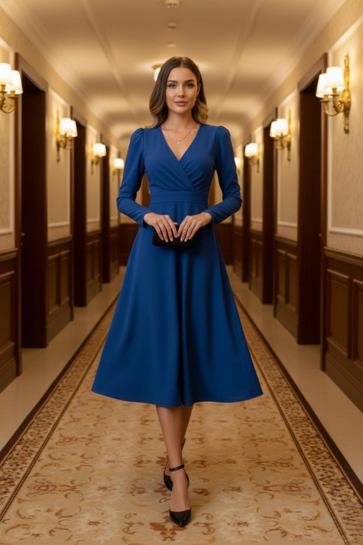 Zamansız Şıklığın Simgesi: Kruvaze Yaka Uzun Kollu Midi Elbise
