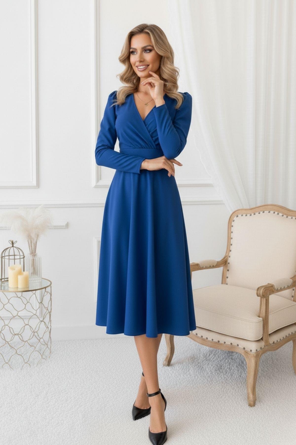 Saks Mavisi Uzun Kollu Kruvaze Yaka Diz Altı Elbise