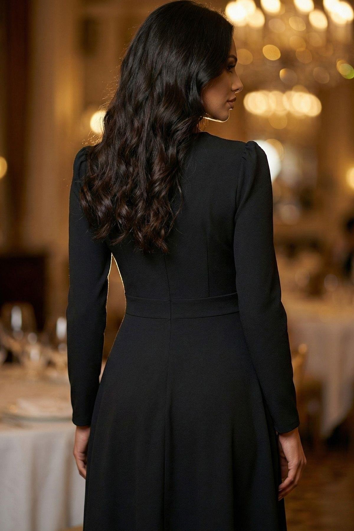 Siyah V Yaka Bel Oturtmalı Midi Elbise – Klasik Şık Abiye Model