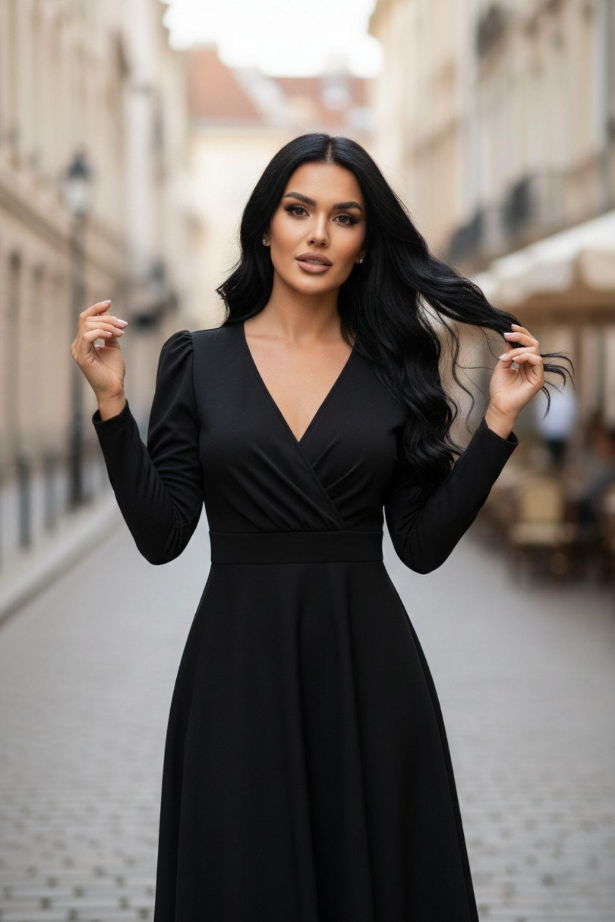 Bu uzun kollu midi elbise, şehir hayatının dinamizmine uyum sağlarken, zarafetinizden ödün vermemeniz için tasarlandı. İş toplantısından arkadaş buluşmalarına, şık bir öğle yemeğinden akşam davetine kadar günün her anına ayak uydurabilen zamansız bir parçadır.