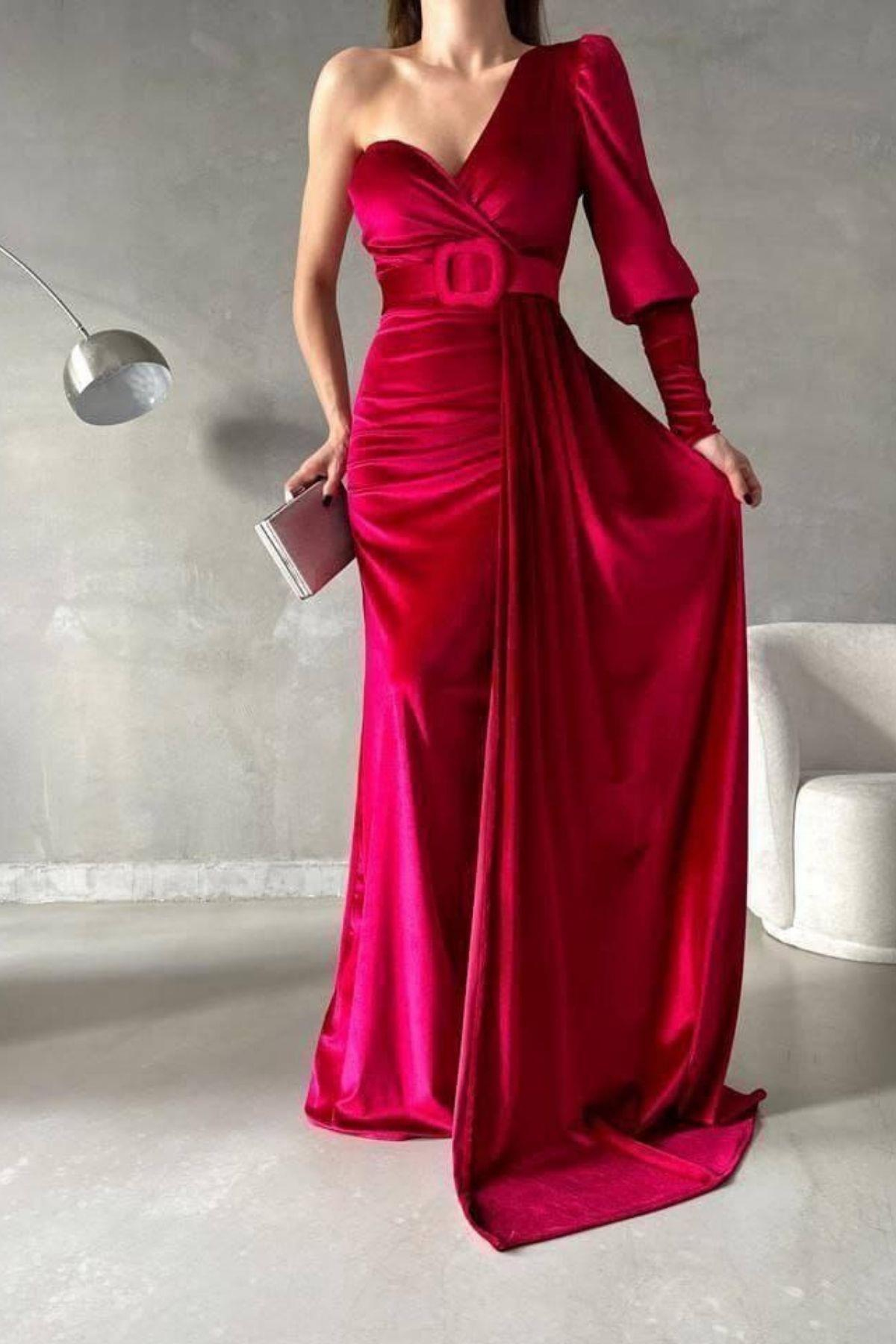 Tek Kol Kemerli Kadife Abiye Elbise - Kırmızı