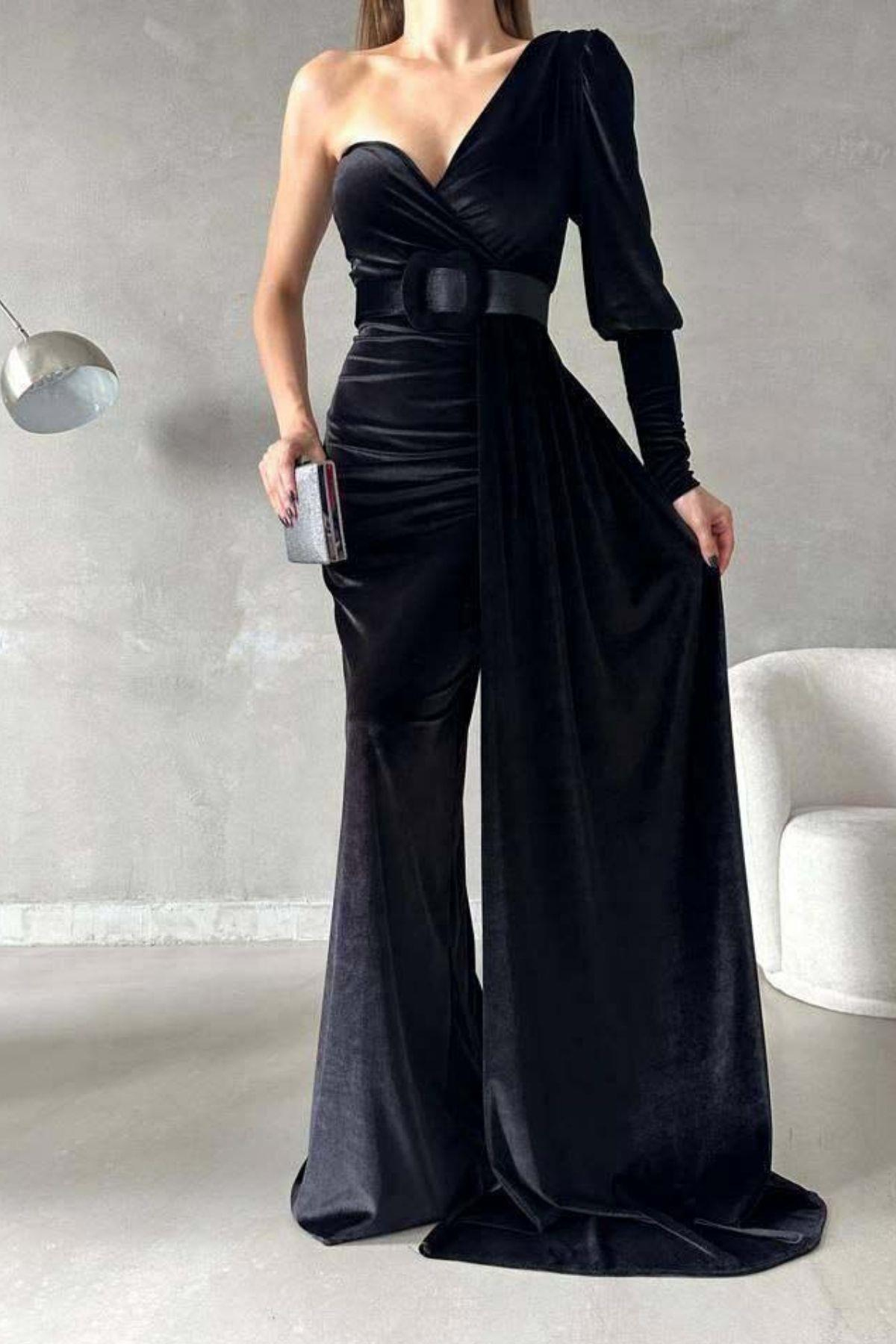 Tek Kol Kemerli Kadife Abiye Elbise - Siyah