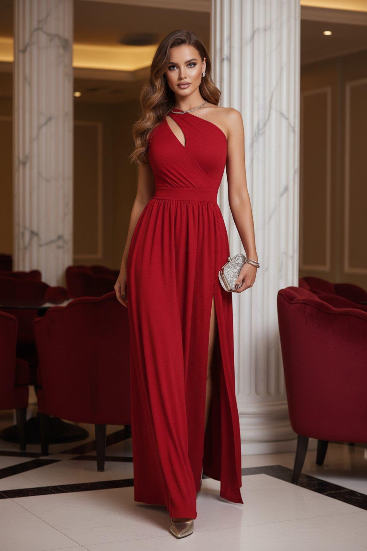 Tek Omuz Asimetrik Yaka Yırtmaç Detaylı Elbise Kırmızı (JS46093-KIRMIZI)