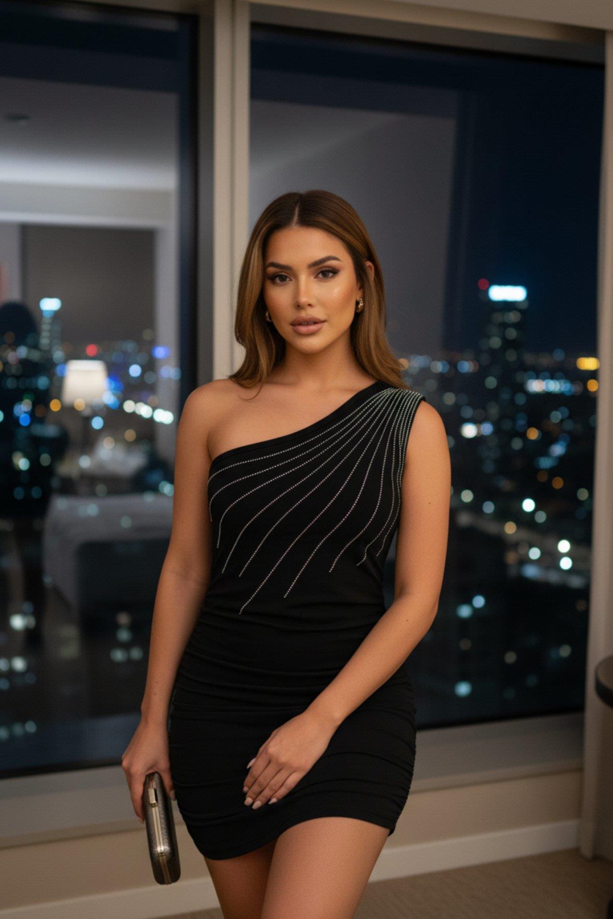 Tek Omuz Taşlı Mini İthal Krep Elbise - Siyah