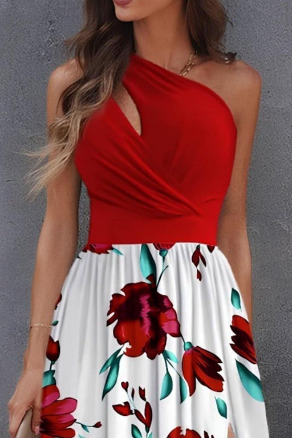 Tek Omuz Yırtmaçlı Desenli Elbise - Kırmızı