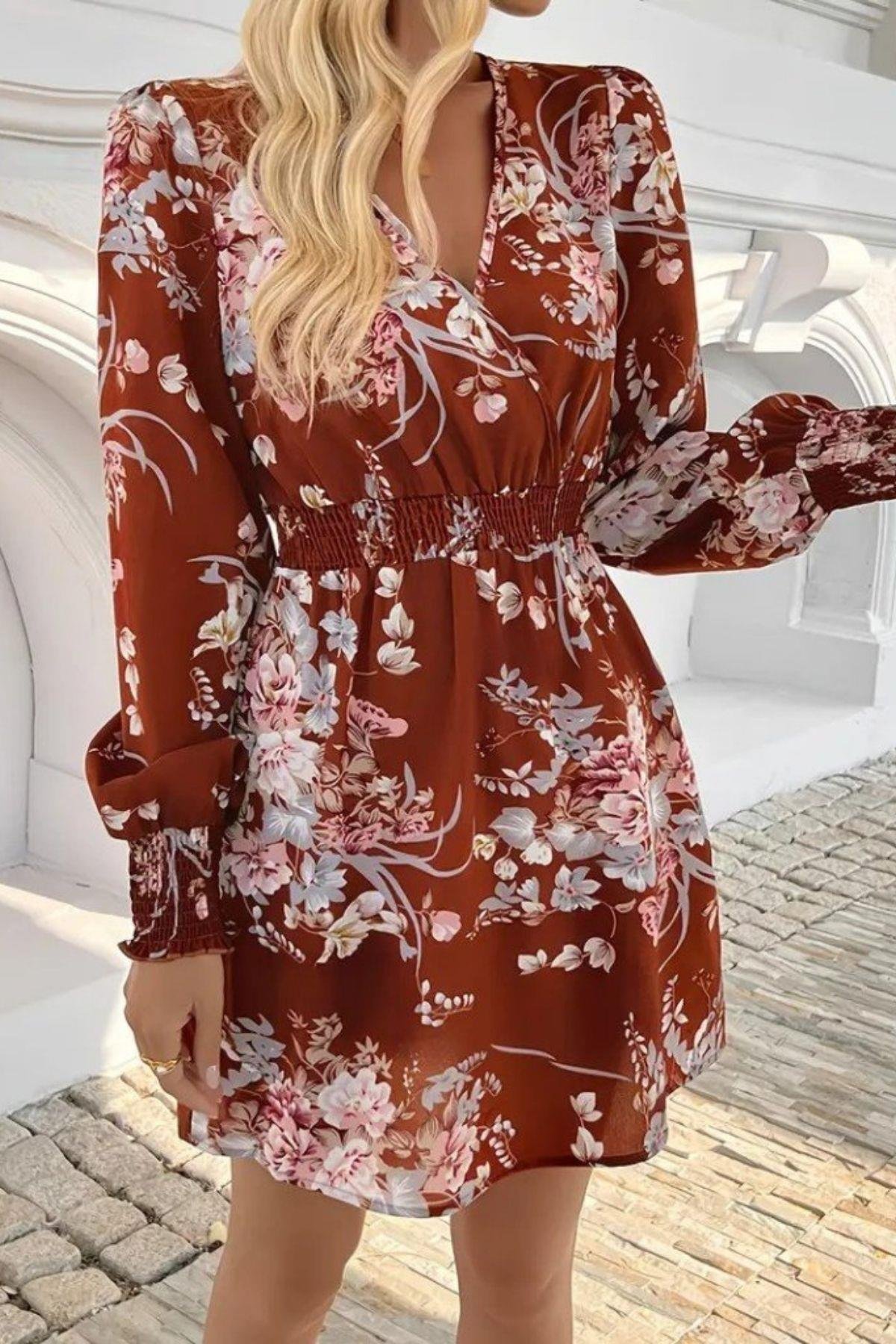 Uzun Kollu Çiçek Desenli Süprem Elbise - Desenli