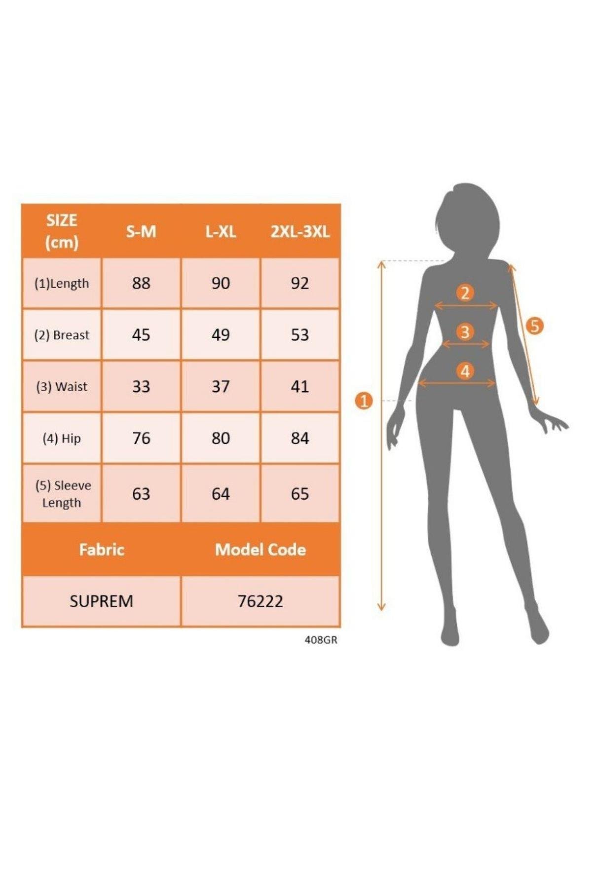 • Tasarım Özellikleri: Kruvaze V yaka, beli esnek lastikli (smock/büzgülü), büzgülü manşetli uzun kol, A kesim etek.