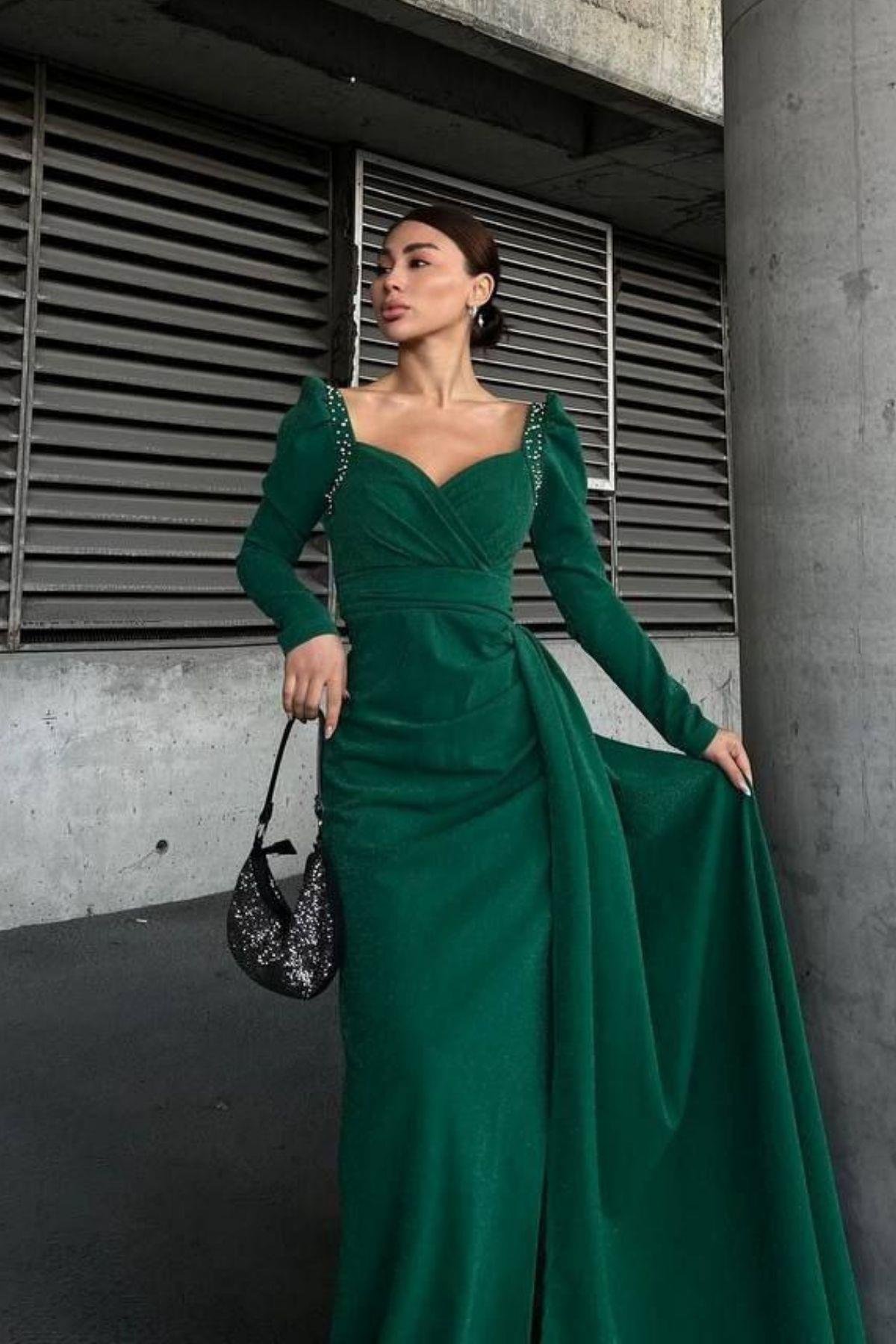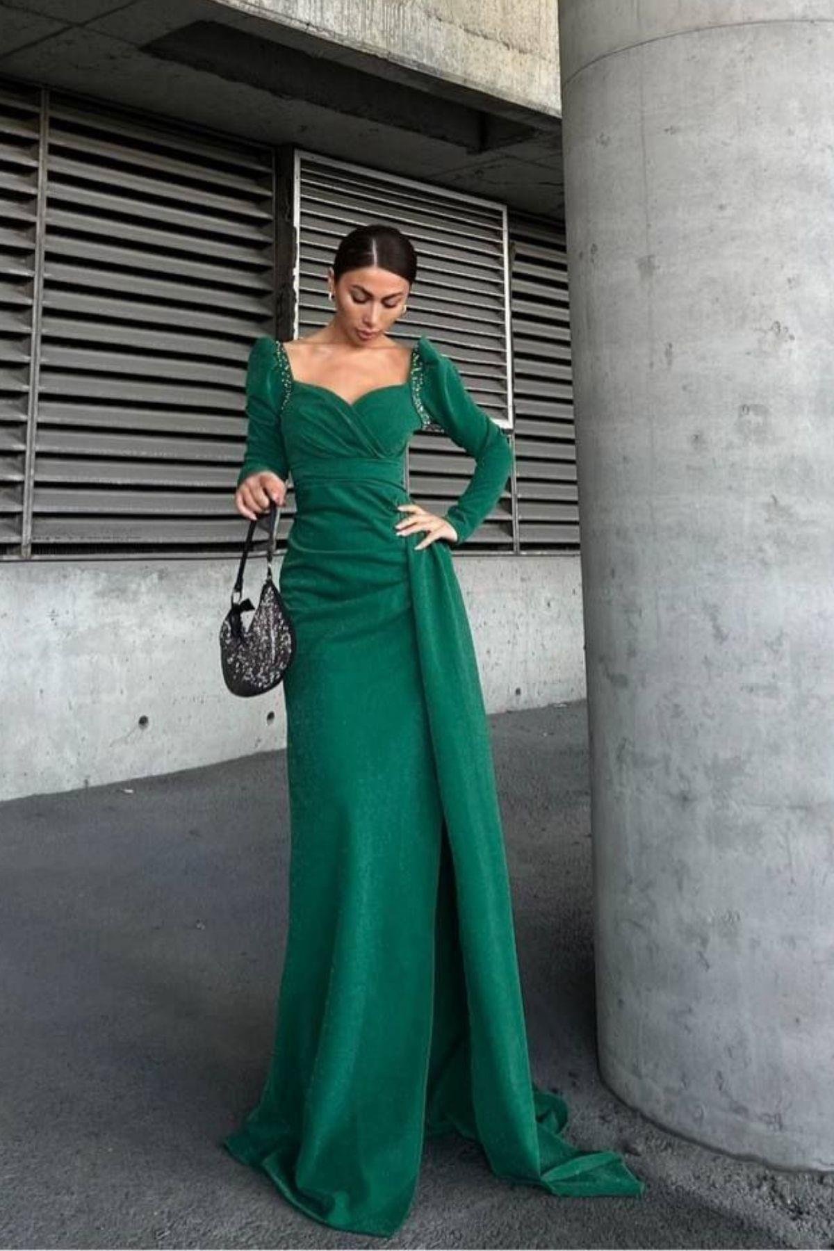 Uzun Kollu Kalp Yaka Taş Detaylı Simli Krep Abiye Elbise - Yeşil (EL583039-YEŞİL)