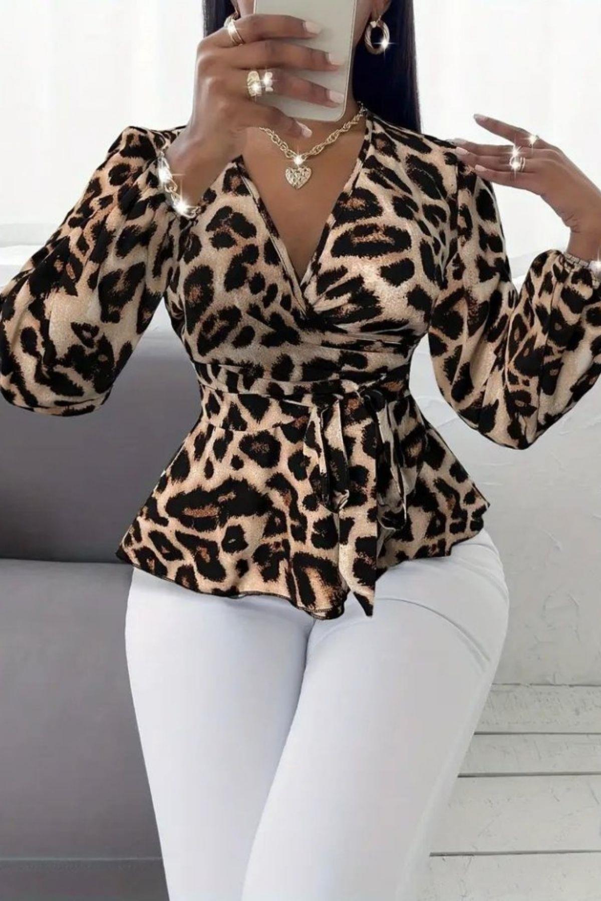 Uzun Kollu Kruvaze Yaka Leopar Desenli Süprem Bluz - Kahve