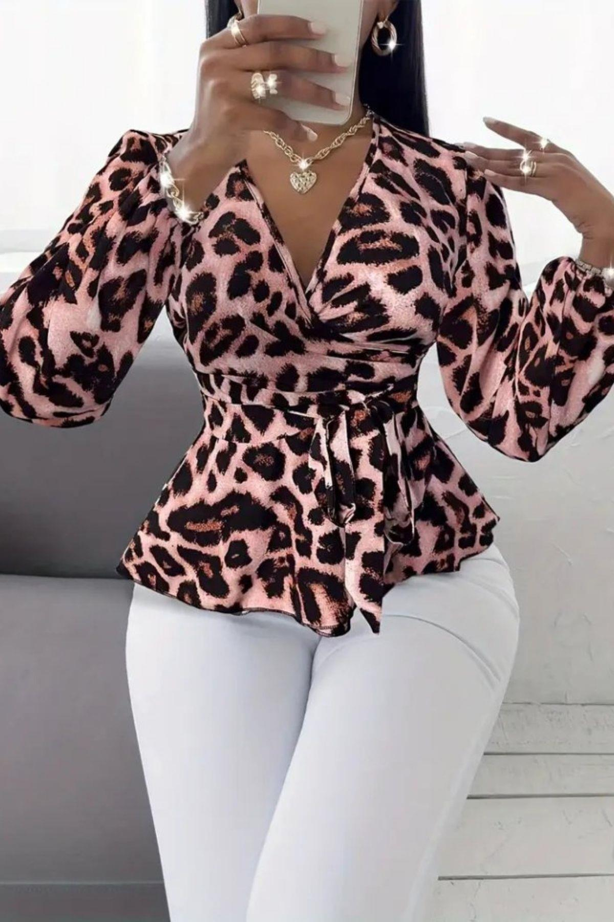 Uzun Kollu Kruvaze Yaka Leopar Desenli Süprem Bluz - Pembe