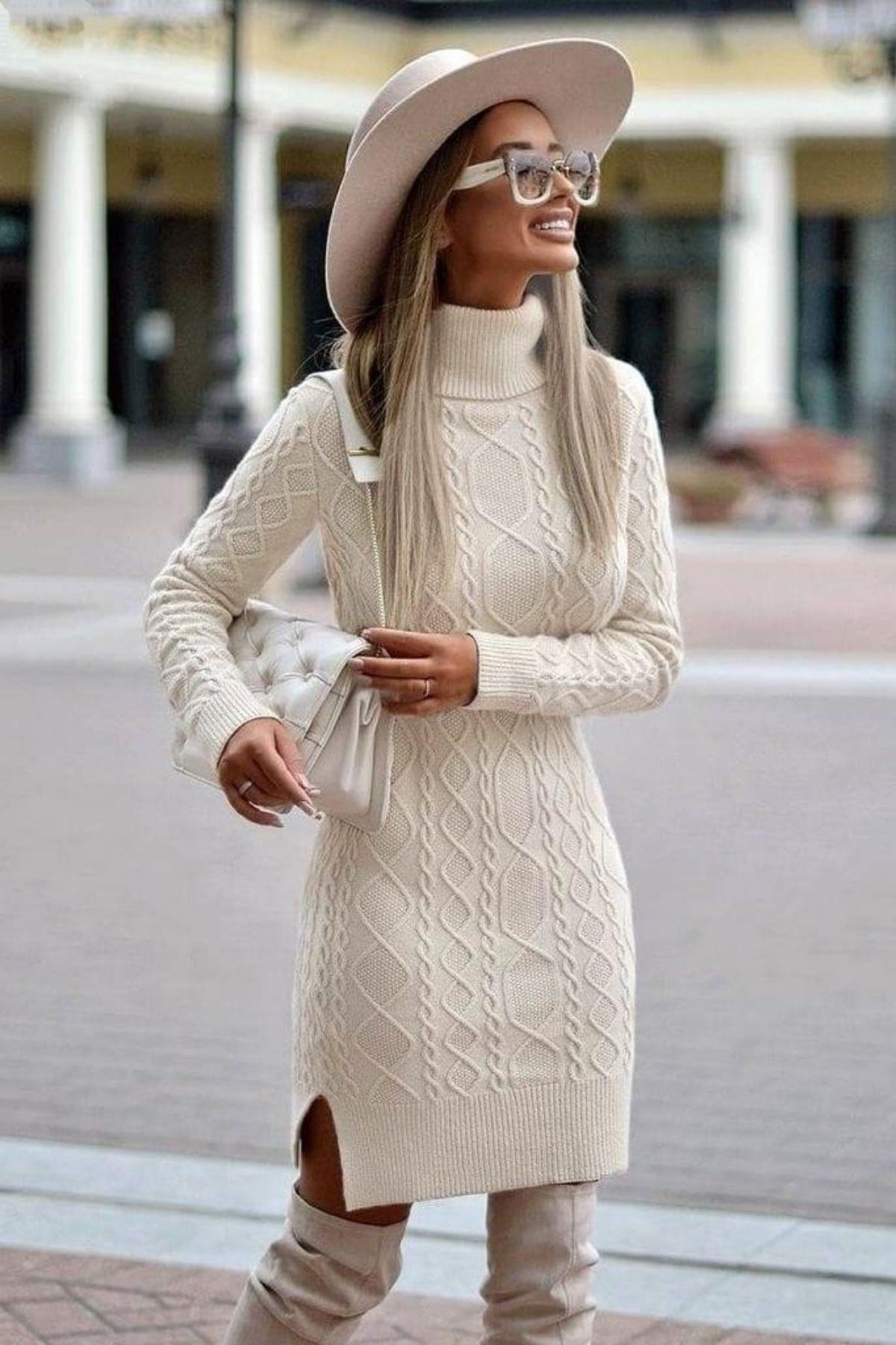 Örgü Desenli Balıkçı Yaka Triko Elbise