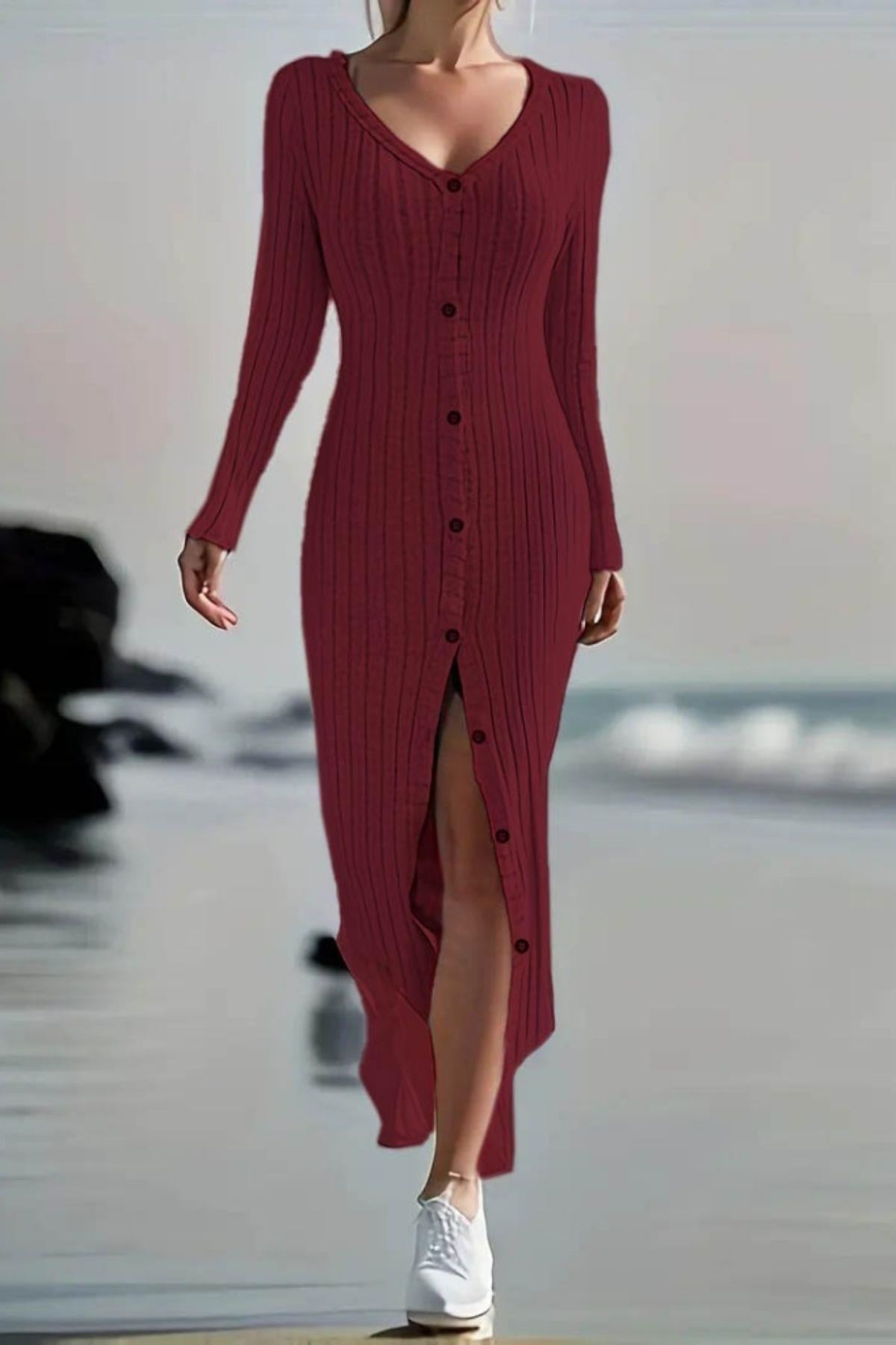 Uzun Kollu Önden Düğmeli Yırtmaçlı Kaşkorse Elbise - Bordo