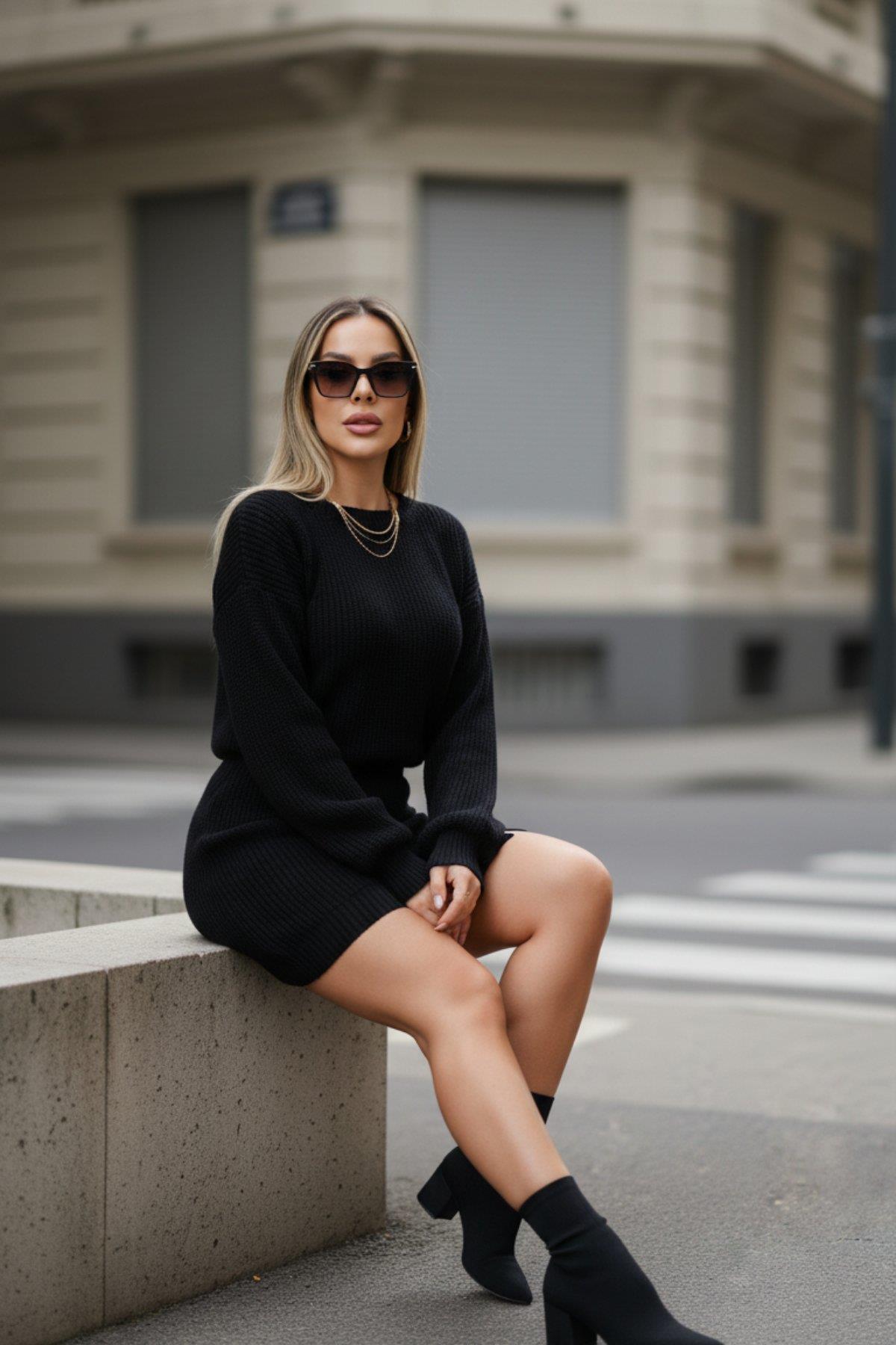 Uzun Kollu Örme Triko Elbise - Siyah (JS63204-SİYAH)